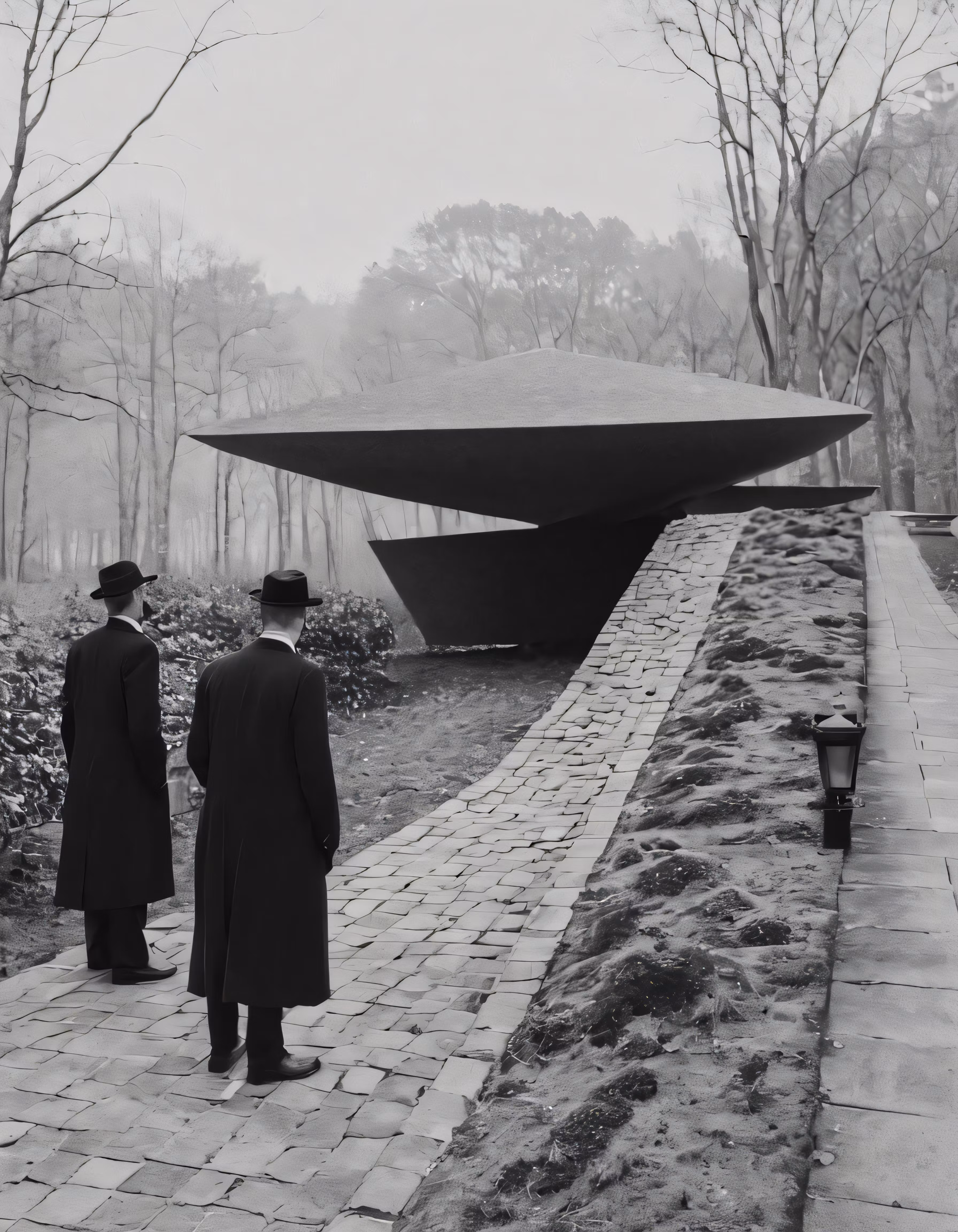 High resolution picture, free to use, three men standing on a brick walkway near some trees