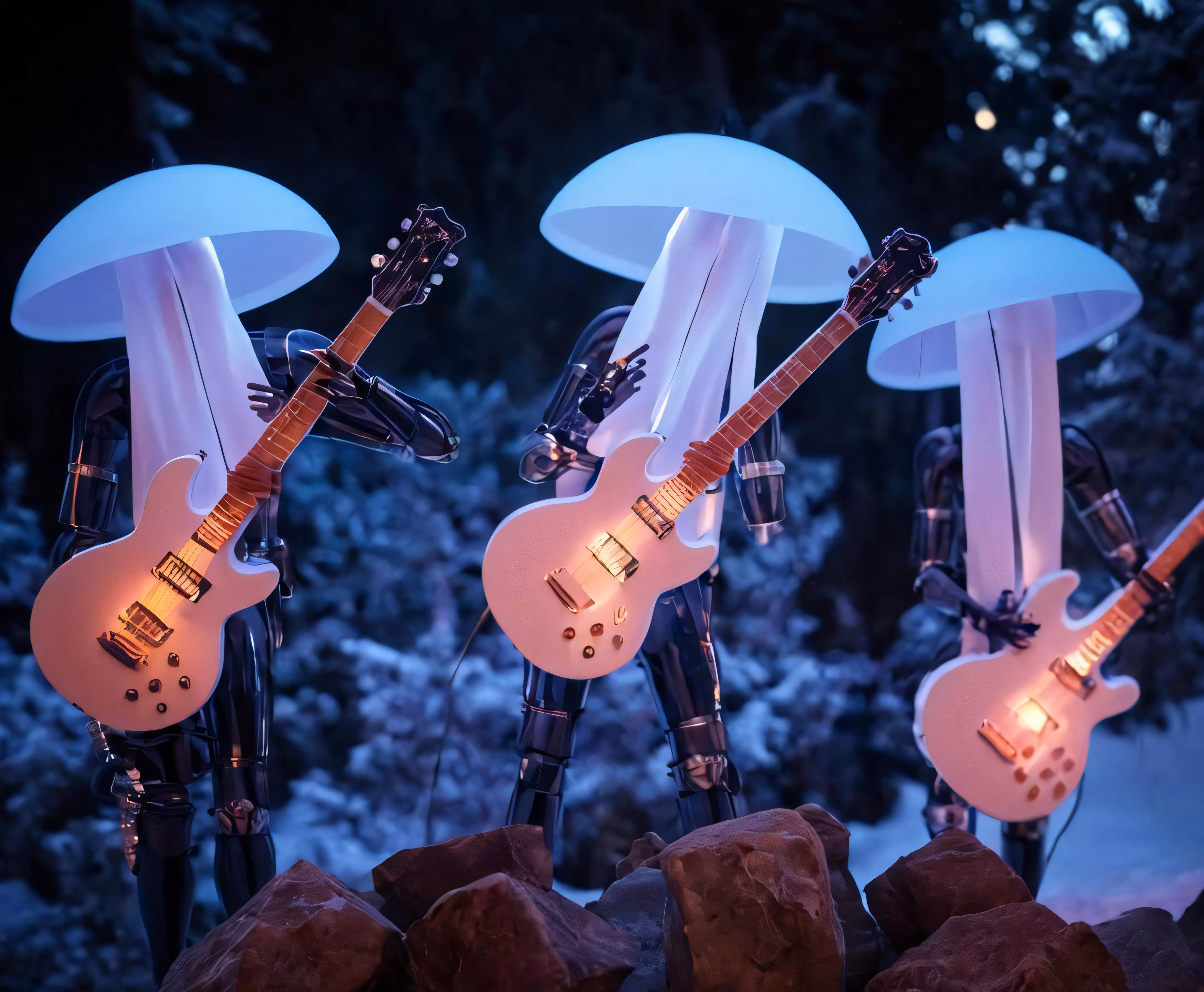 High resolution picture, free to use, three musical instruments are next to each other near a mushroom   like lamp