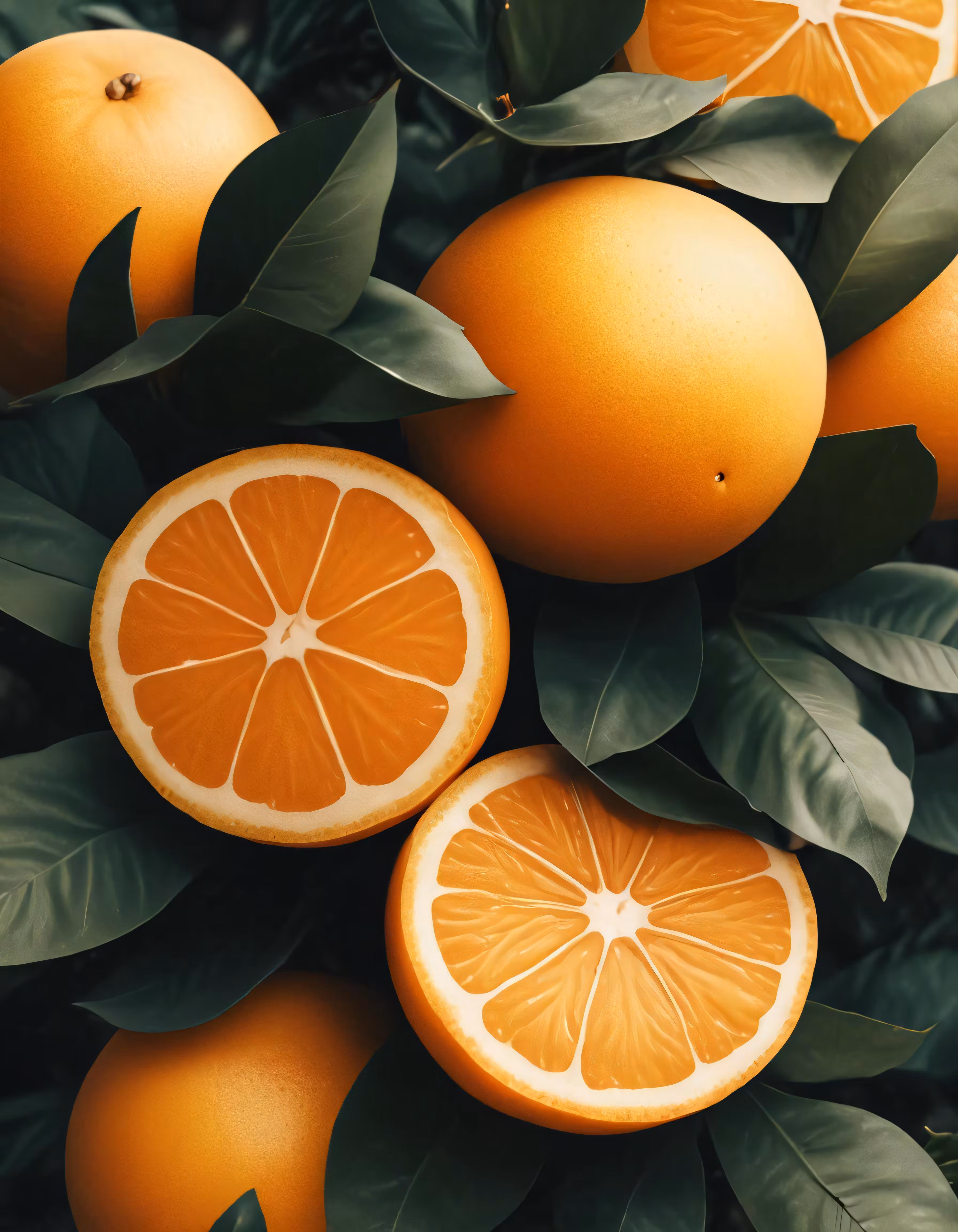 High resolution picture, free to use, three oranges are being cut in half with leaves on the background
