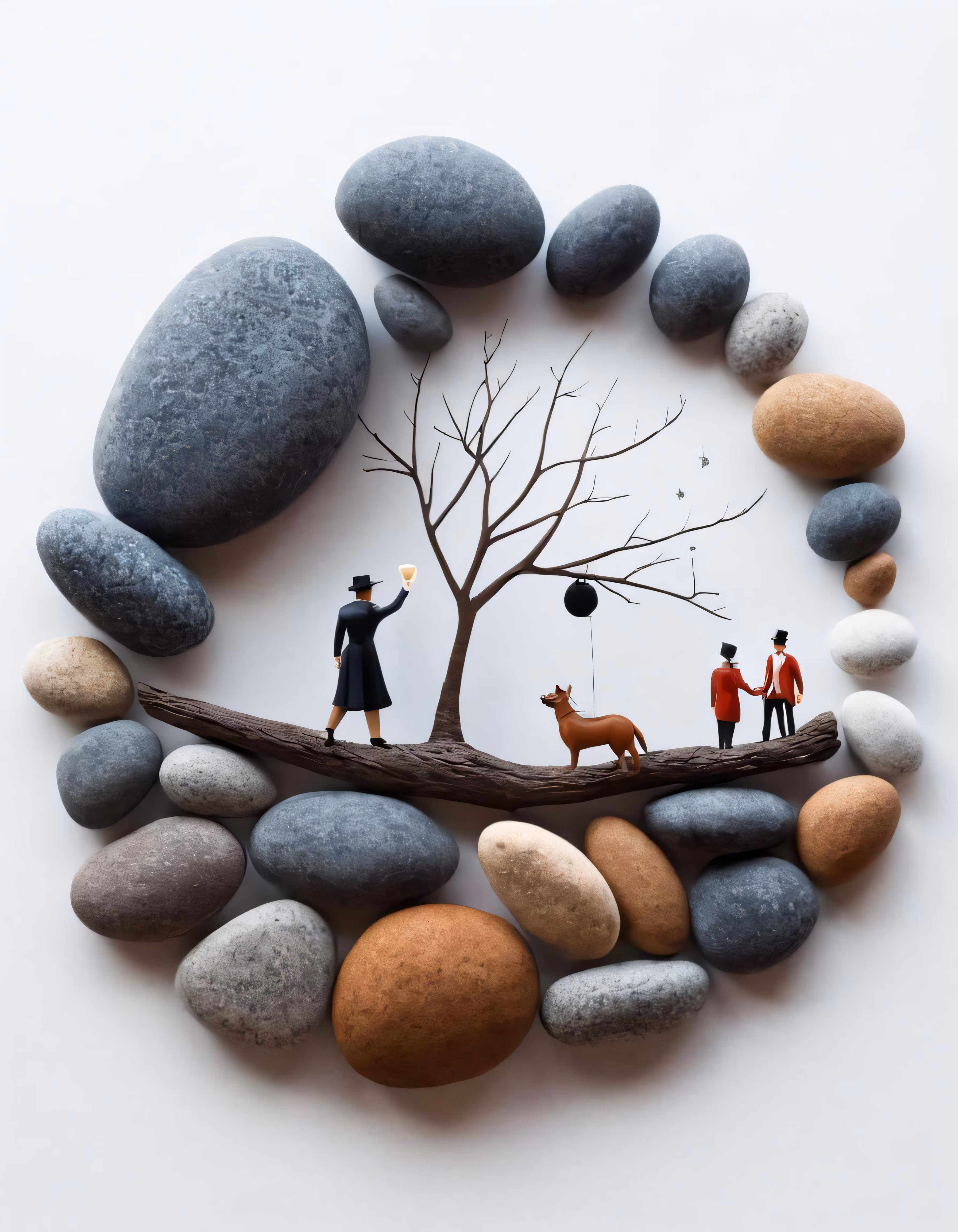 High resolution picture, free to use, three people and a dog on a tree with rocks