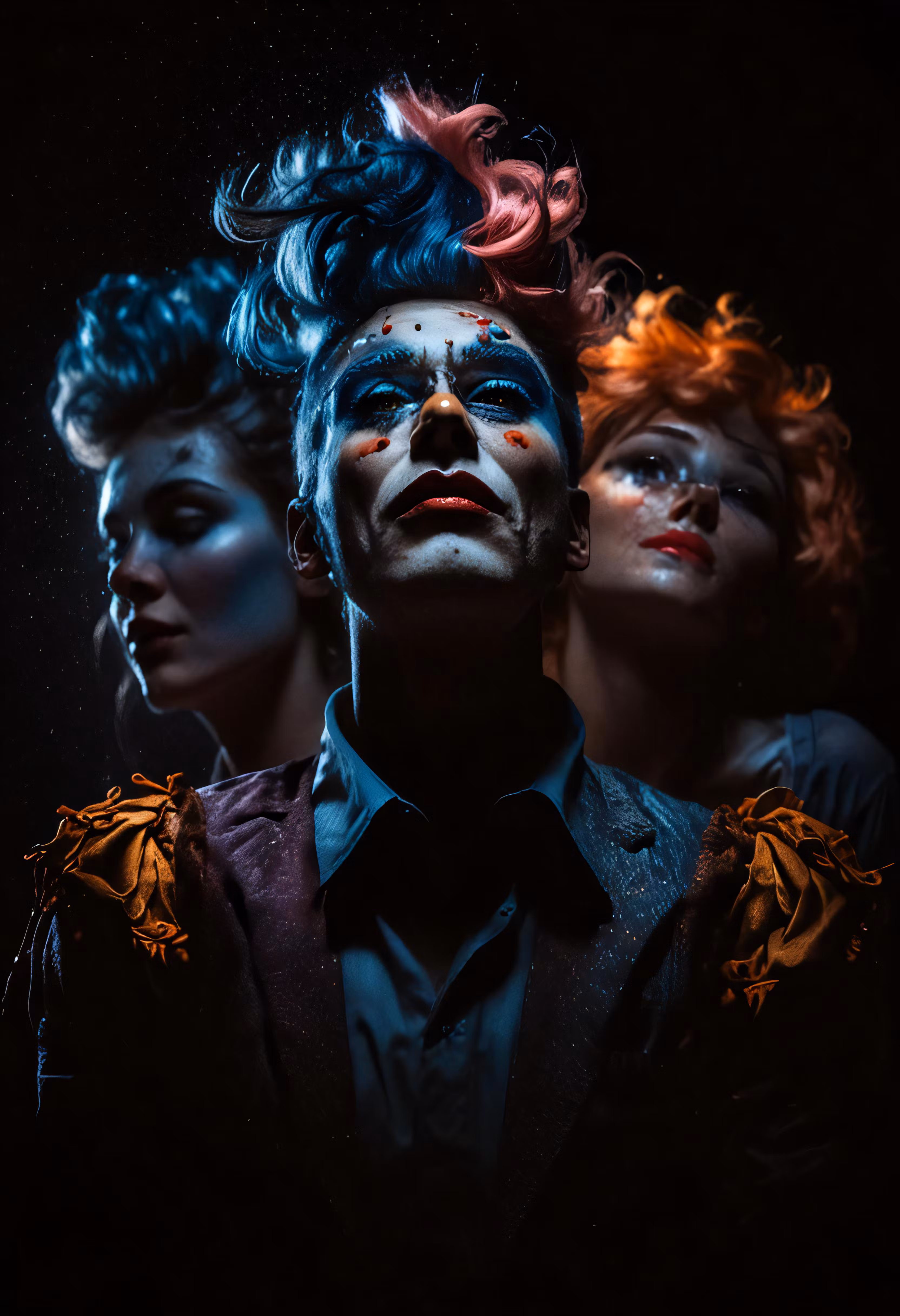 High resolution picture, free to use, three people are wearing clown makeup and wigs in a dark background