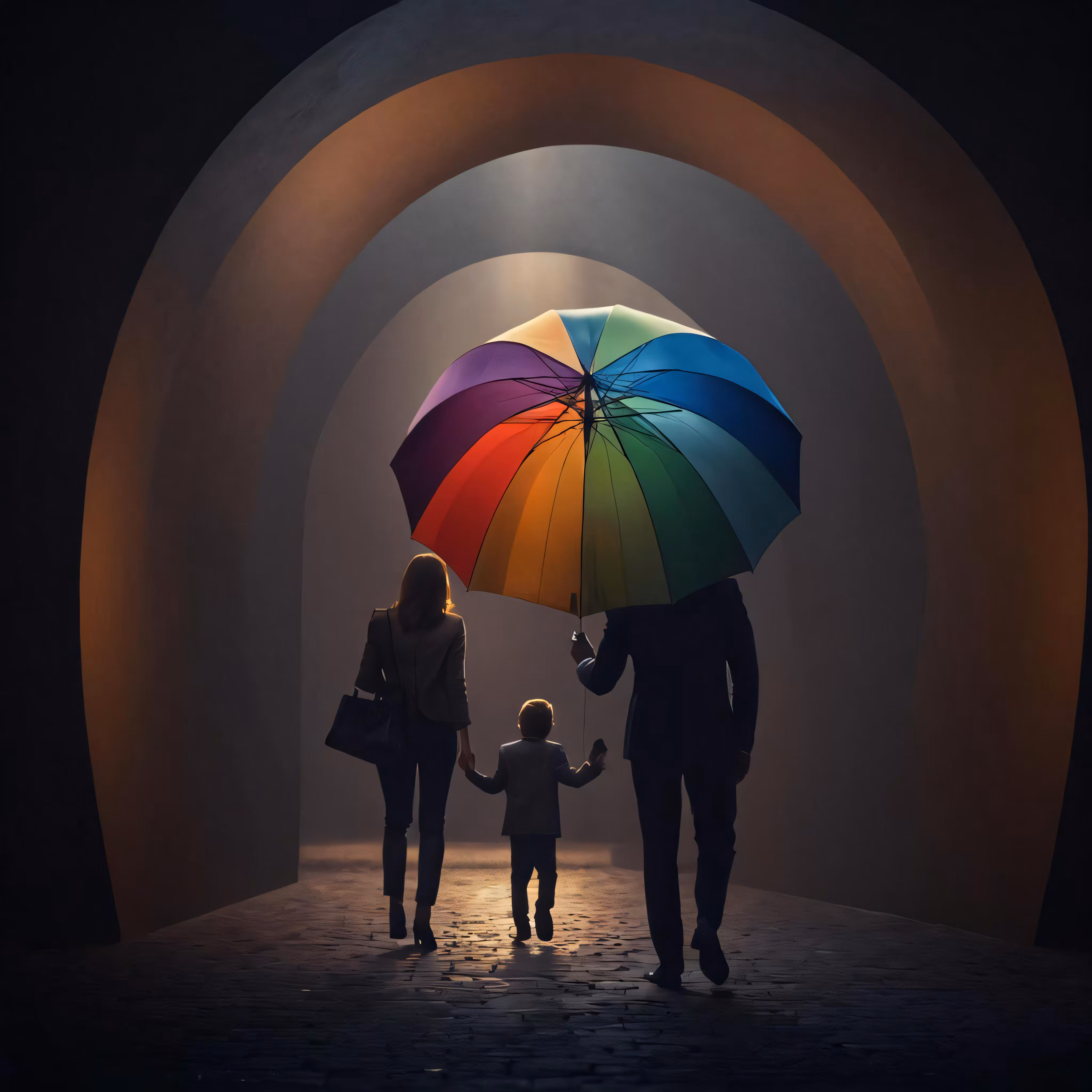 High resolution picture, free to use, three people holding a colorful umbrella as a child stands in front of them