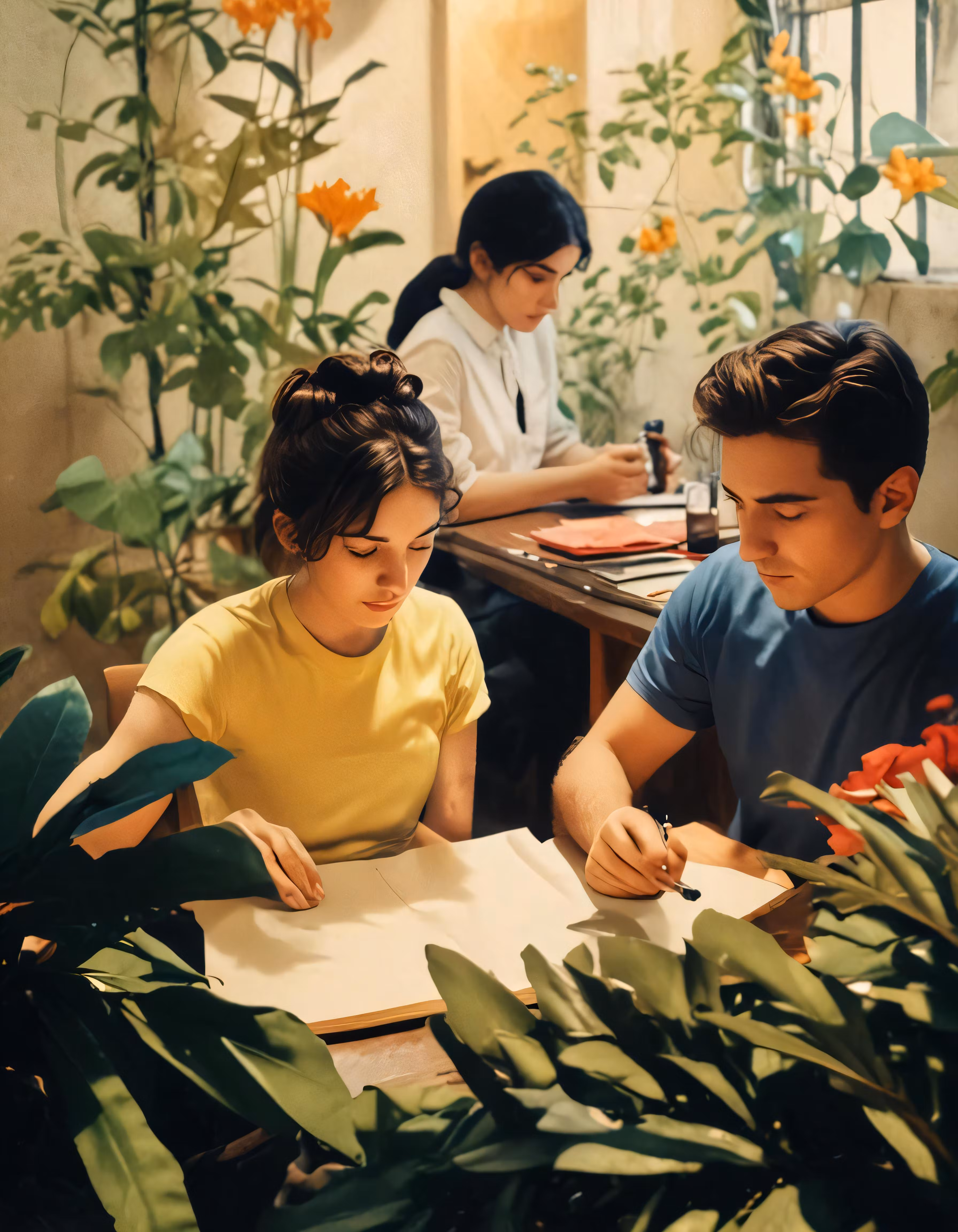 High resolution picture, free to use, three people sitting at a desk working on papers
