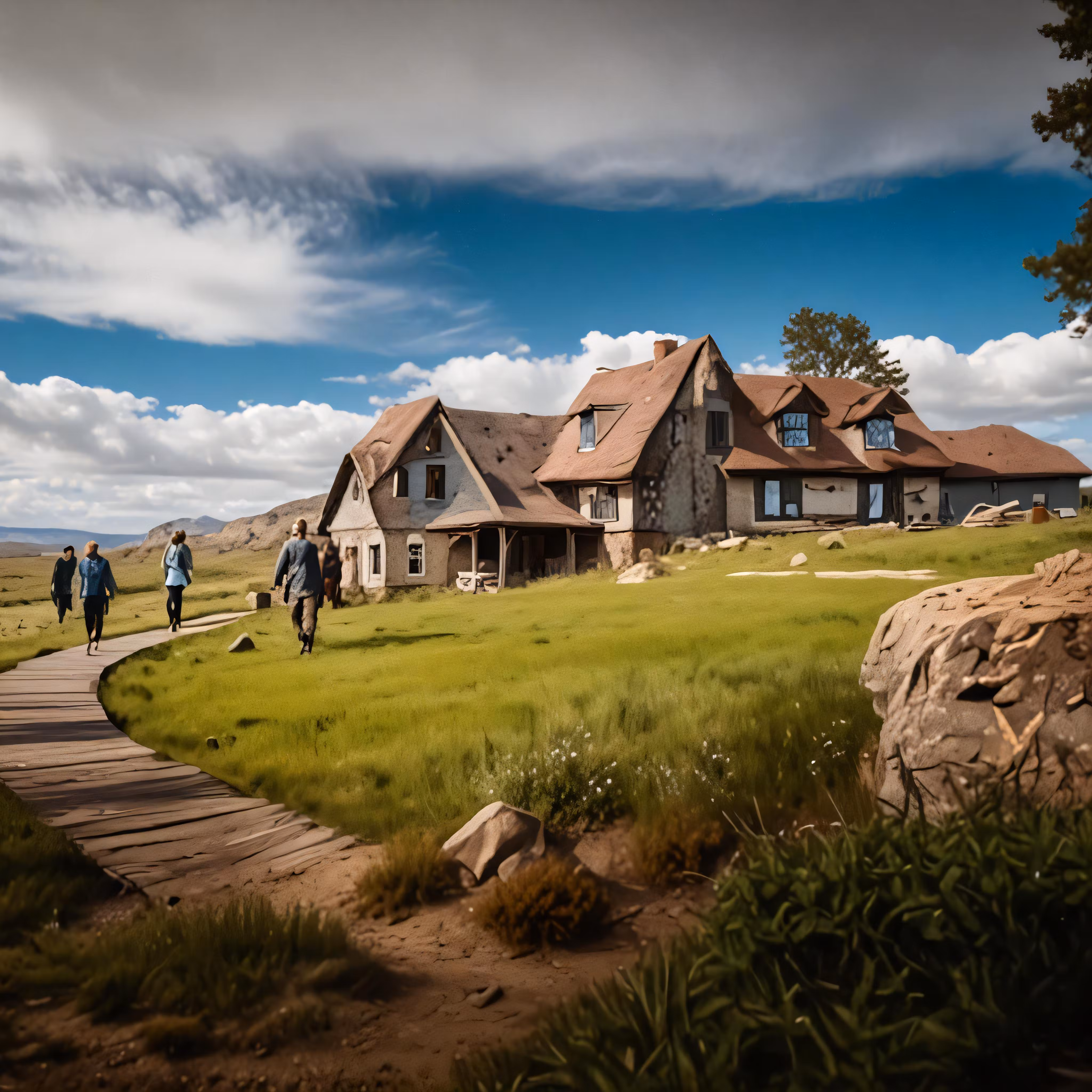 High resolution picture, free to use, three people walk up a path in front of a large house