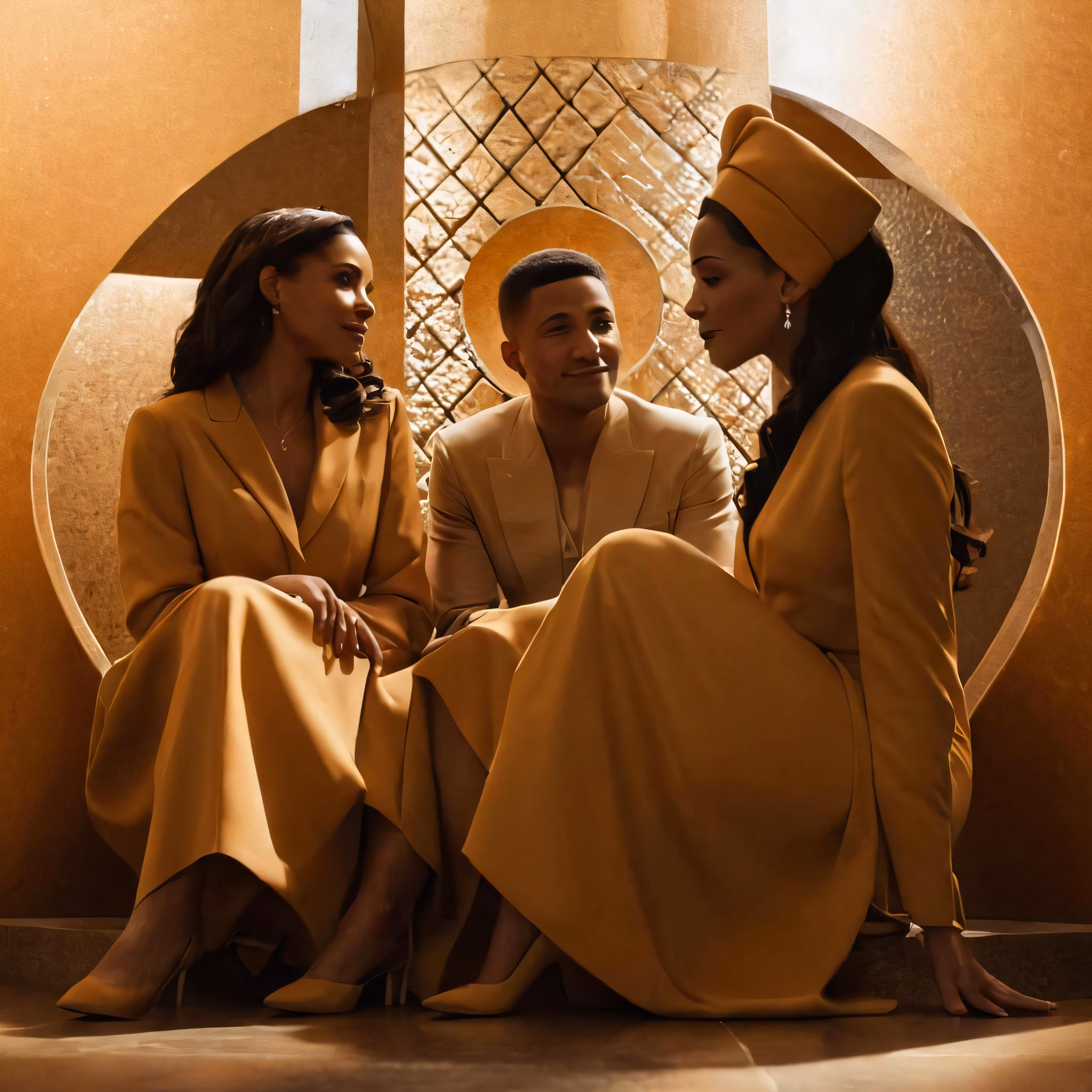 High resolution picture, free to use, three people wearing mustard colored outfits sit on the ground