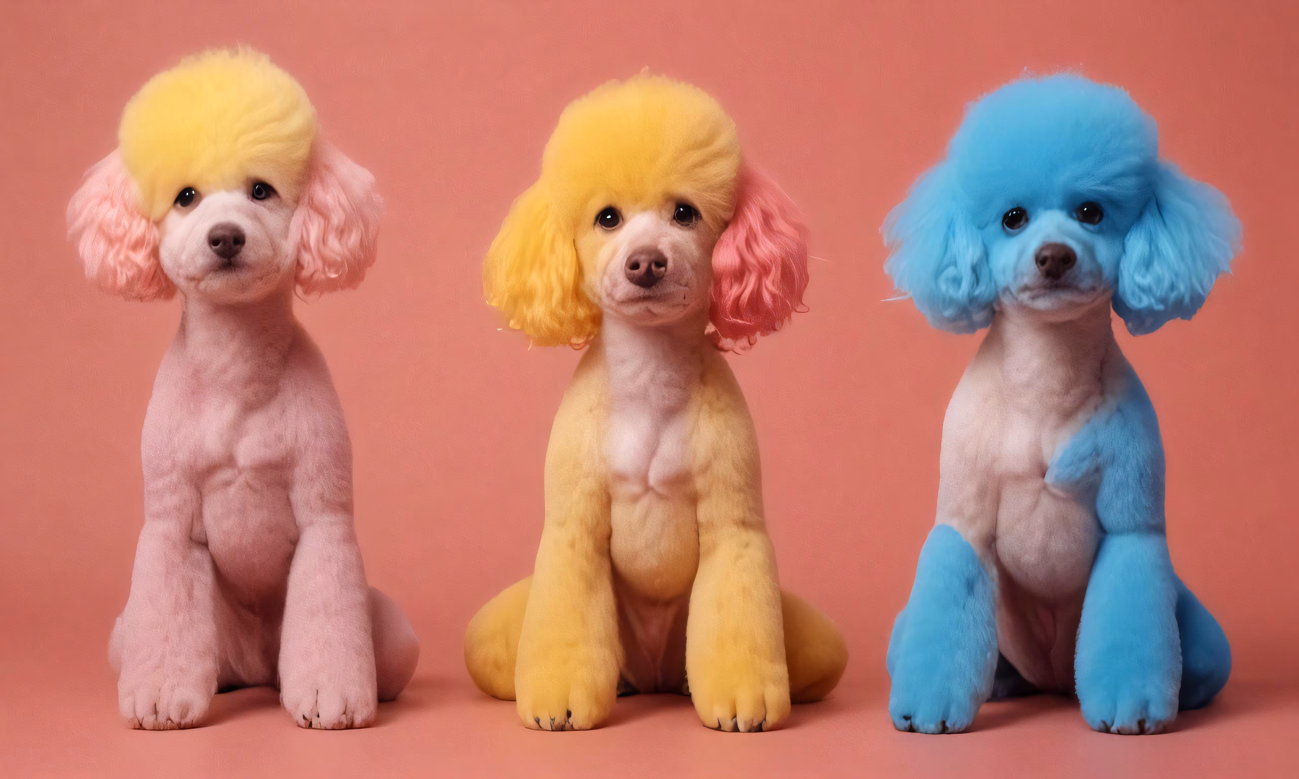 High resolution picture, free to use, three poodles sitting next to each other on pink