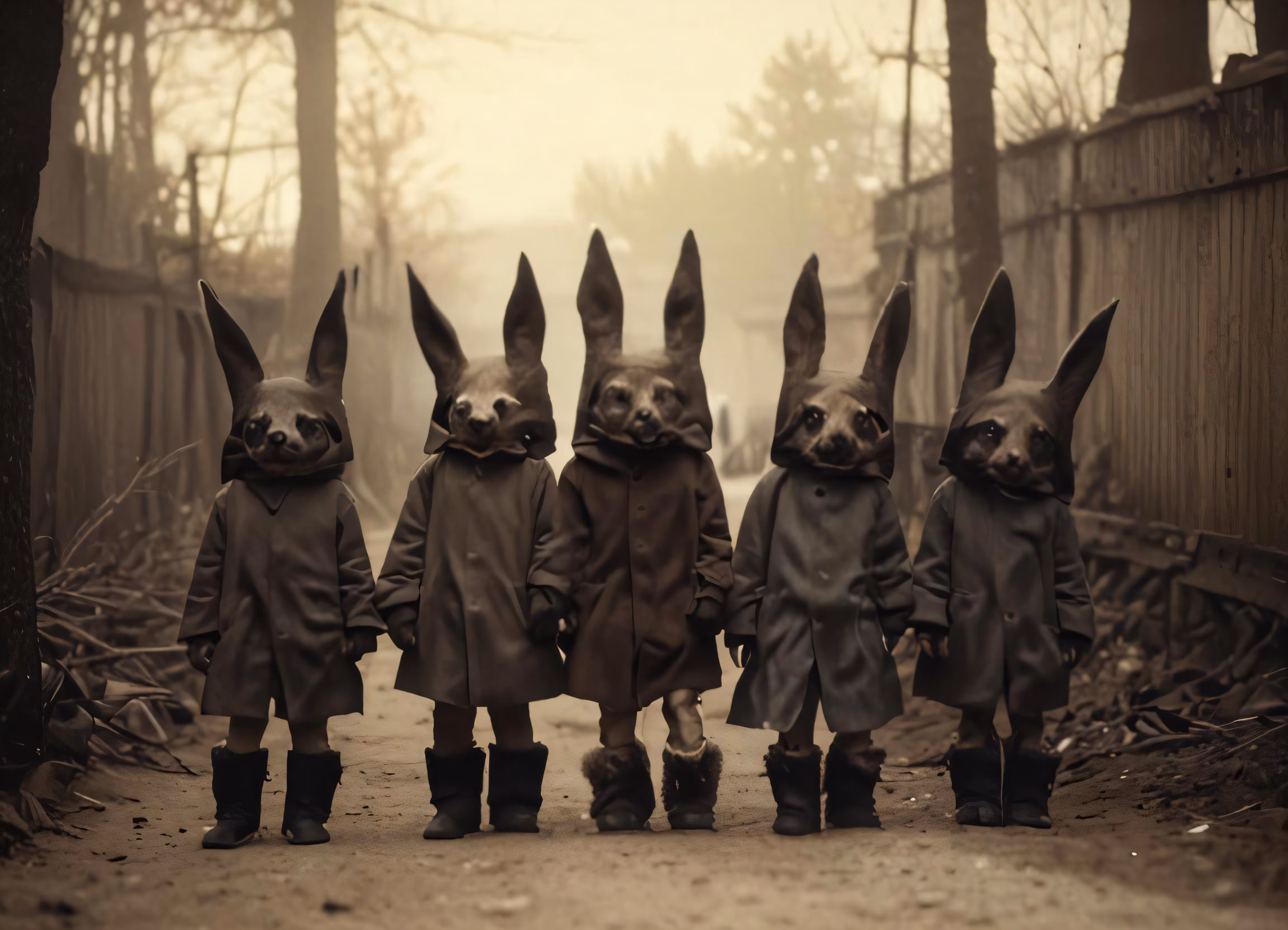 High resolution picture, free to use, three rabbits dressed as men walking past another
