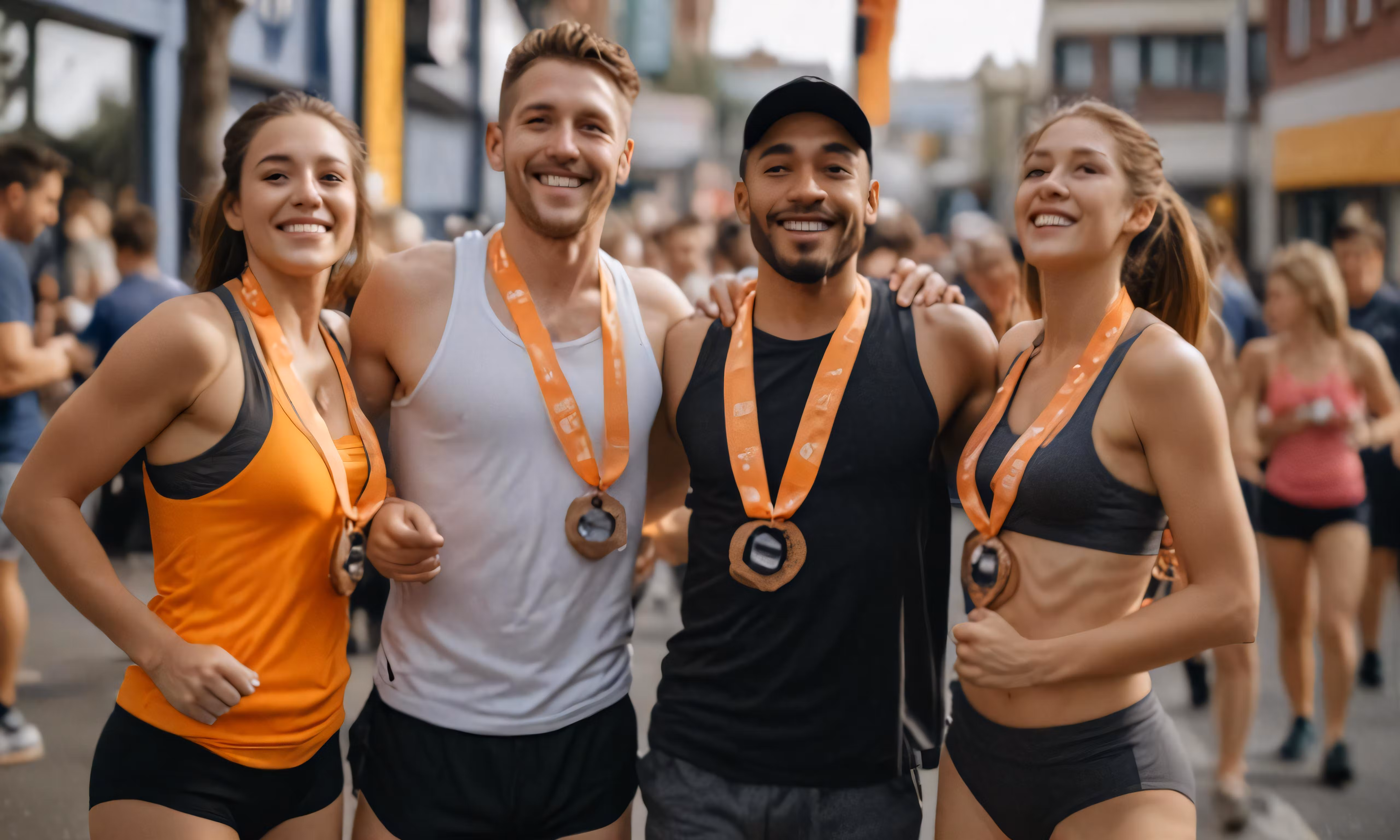 High resolution picture, free to use, three smiling runners pose for the camera in front of a crowd