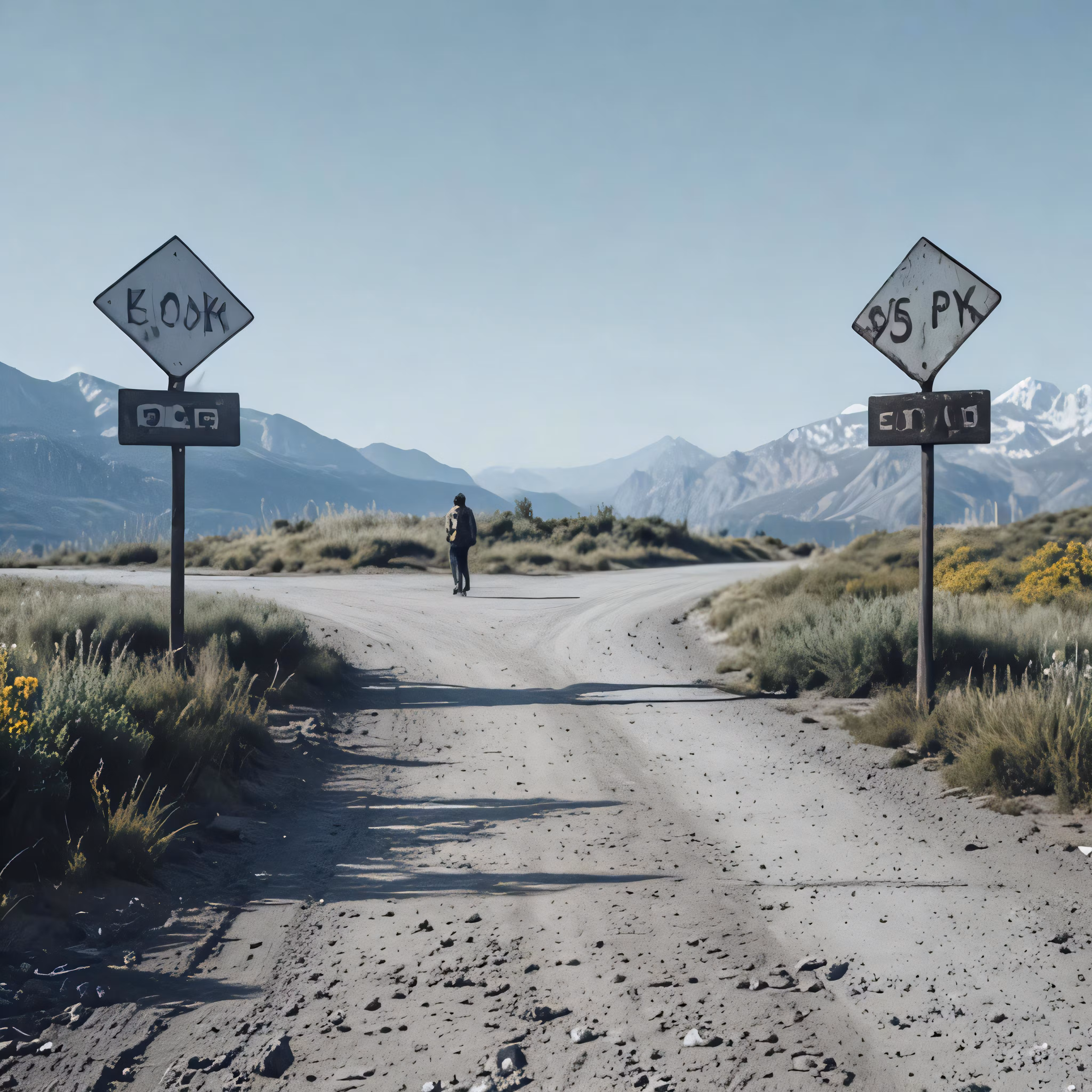 High resolution picture, free to use, three street signs on poles along a dirt road