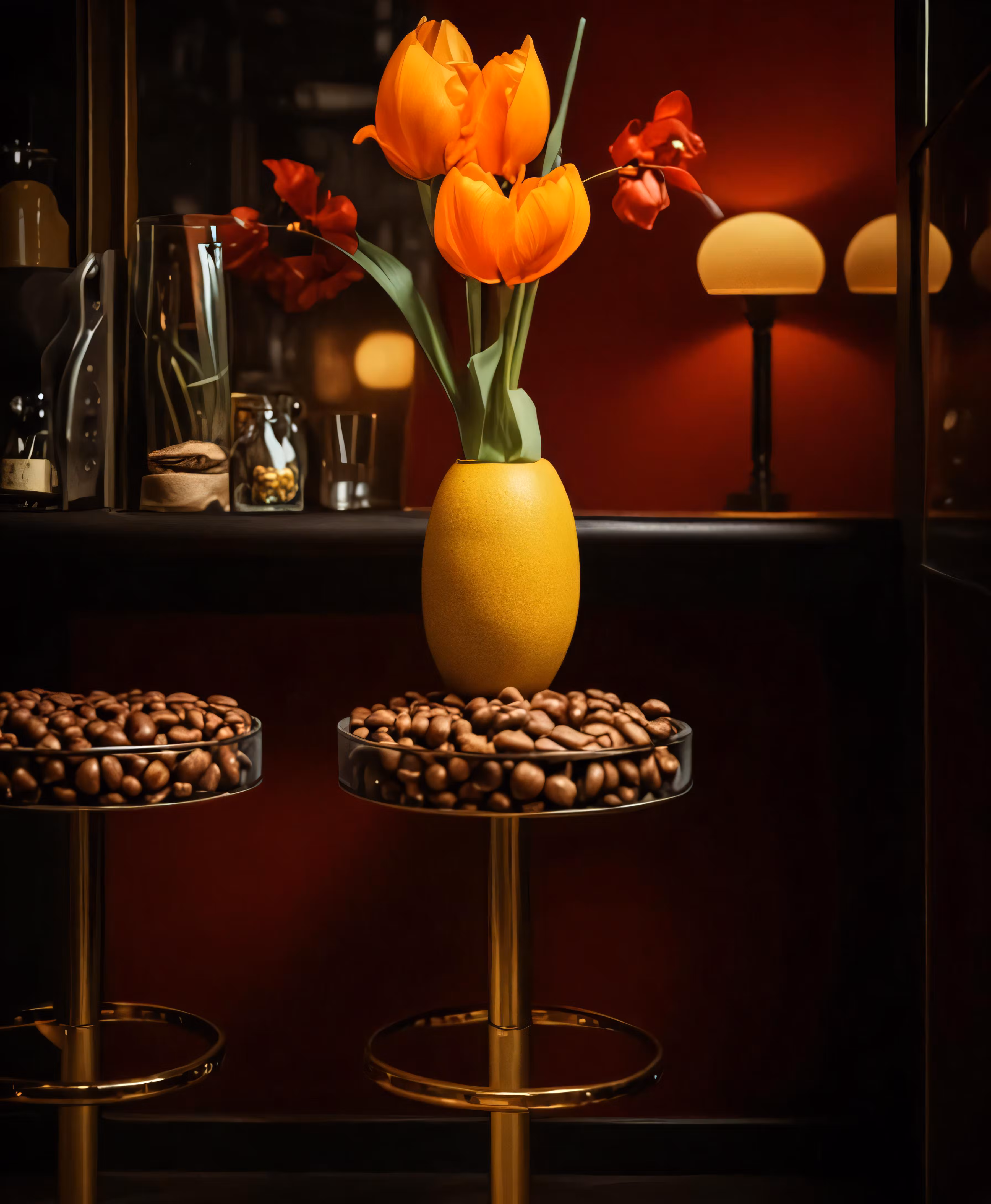 High resolution picture, free to use, three vases with orange flowers and coffee beans