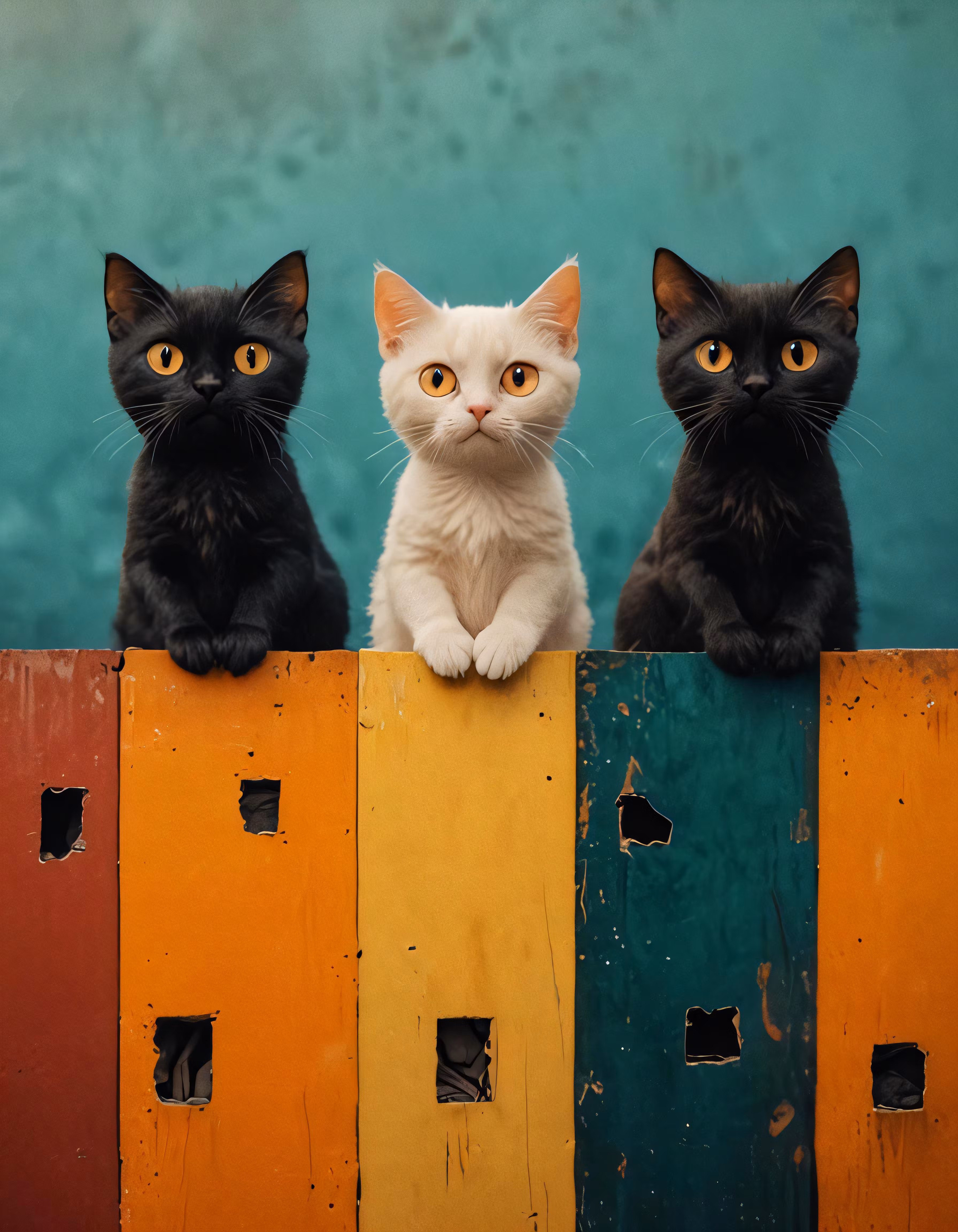 High resolution picture, free to use, three white cats are perched on the top of a rainbow fence