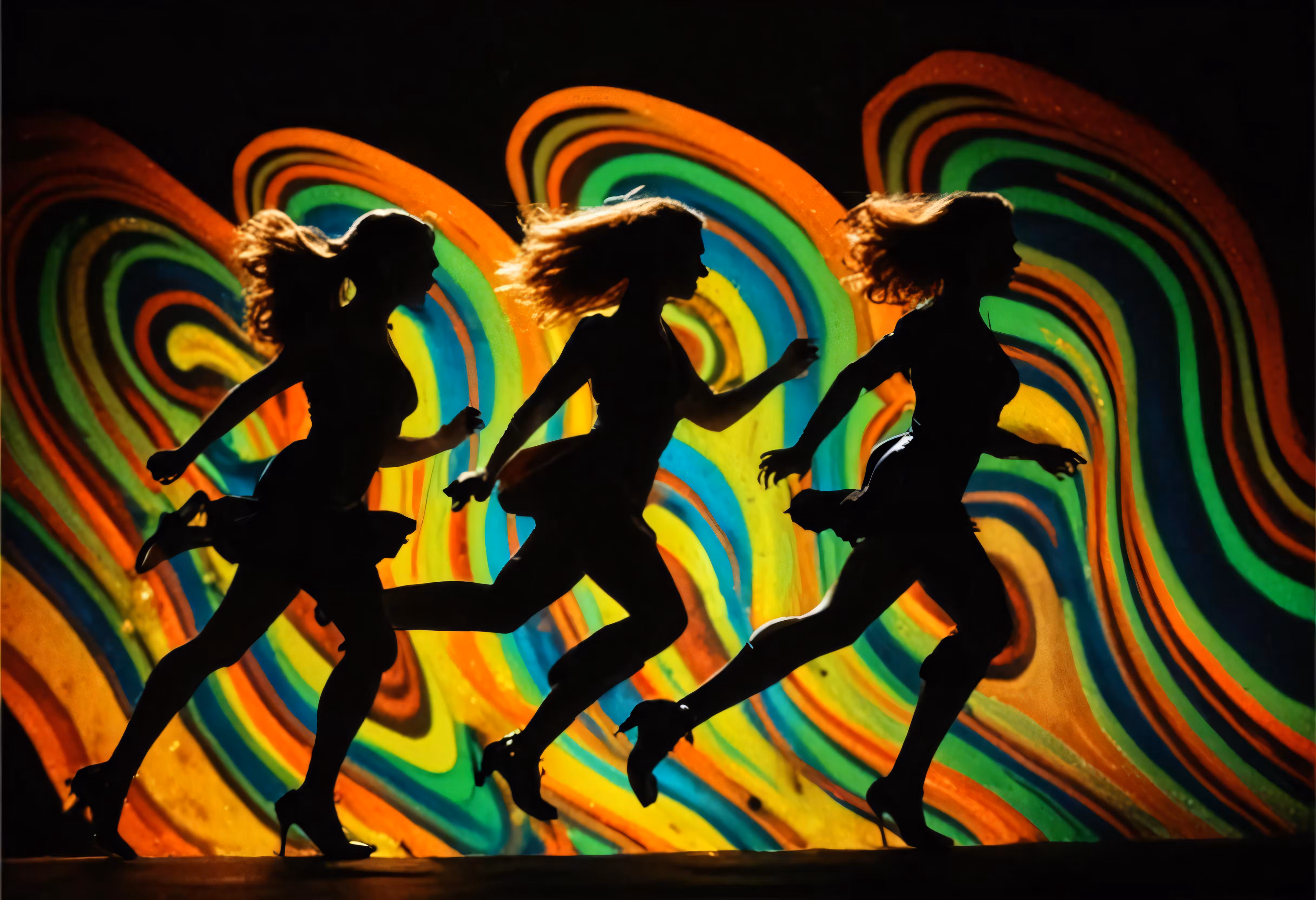 High resolution picture, free to use, three women are running on stage with a colorful backdrop