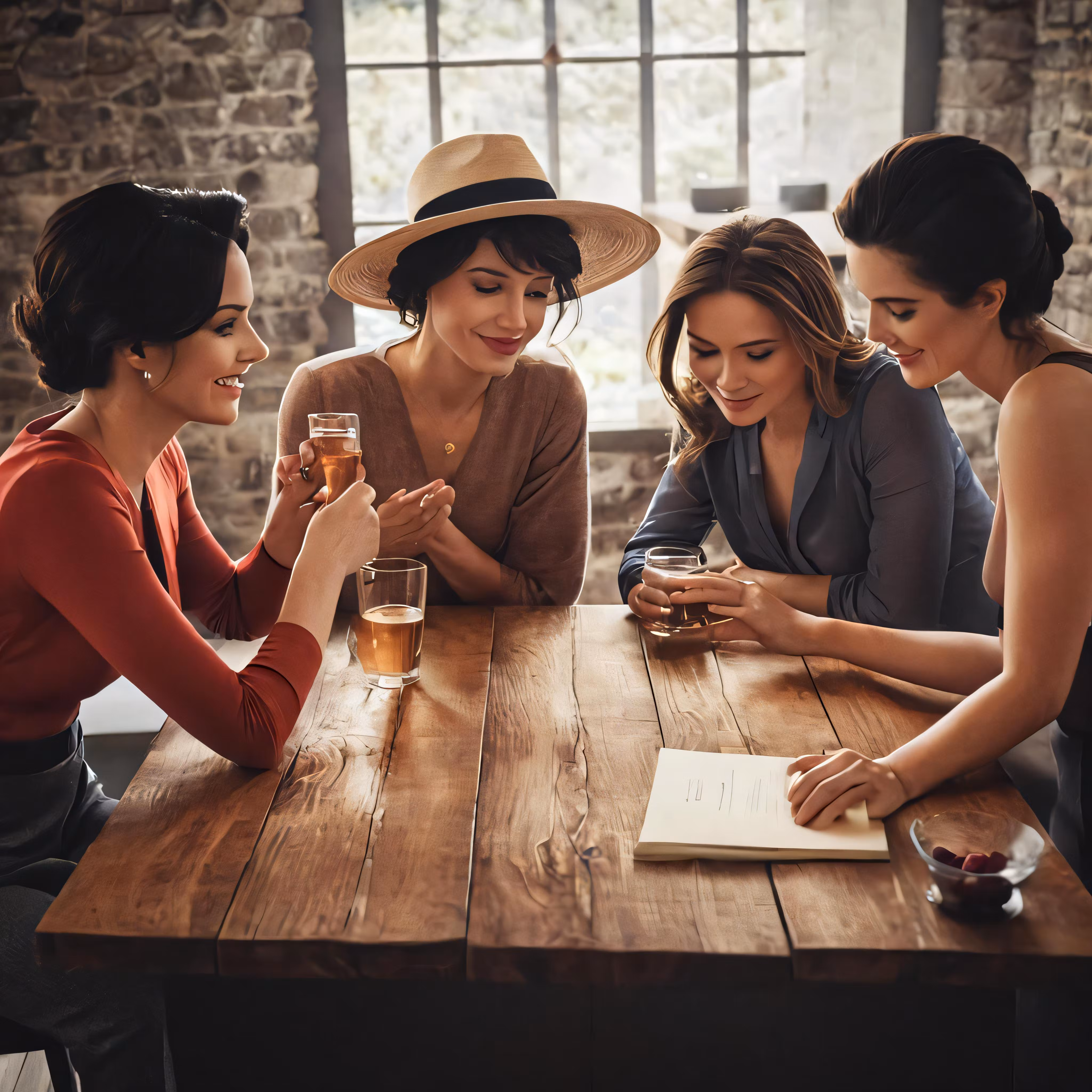 High resolution picture, free to use, three women gathered around a wooden table looking at a cellphone