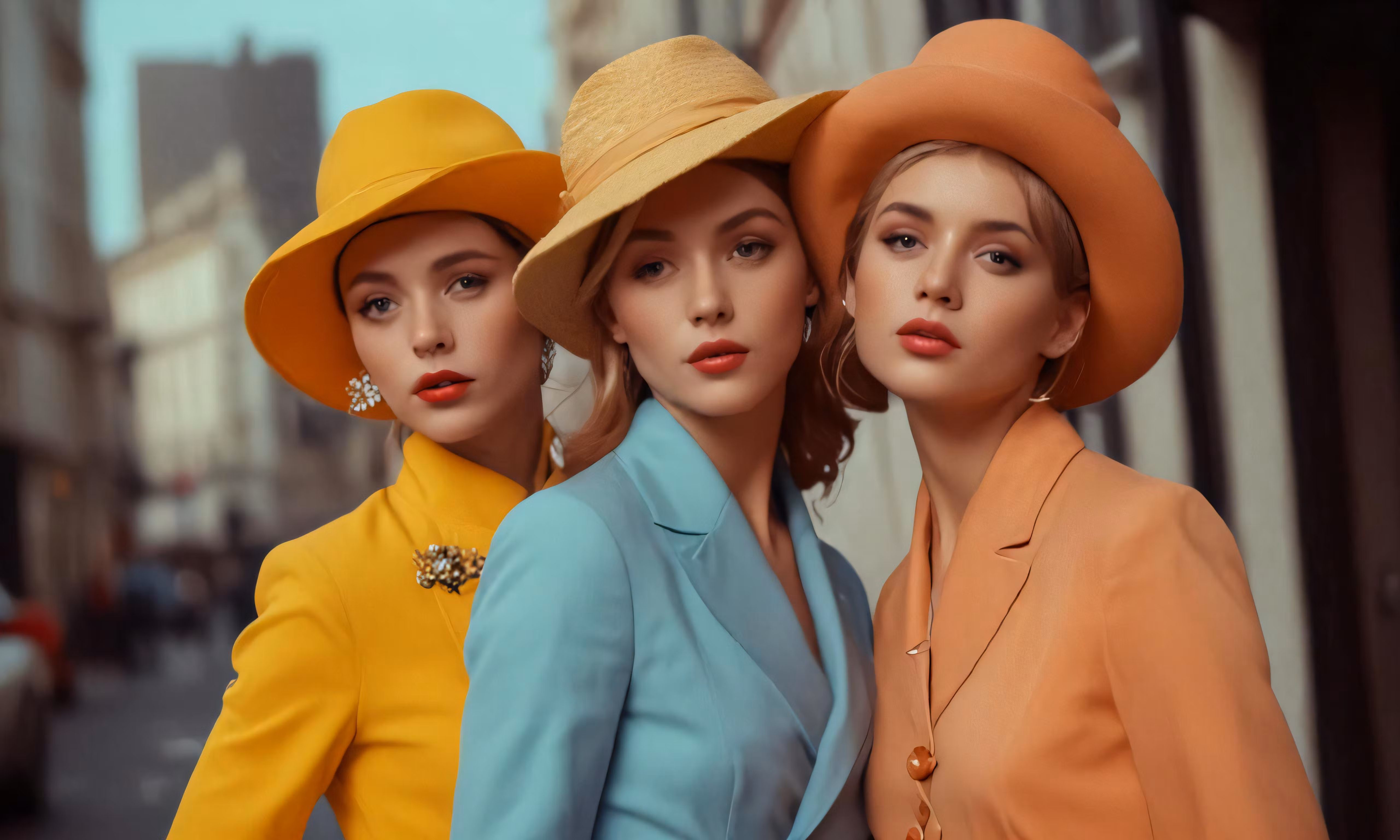High resolution picture, free to use, three women in hats wearing identical outfits in front of a street
