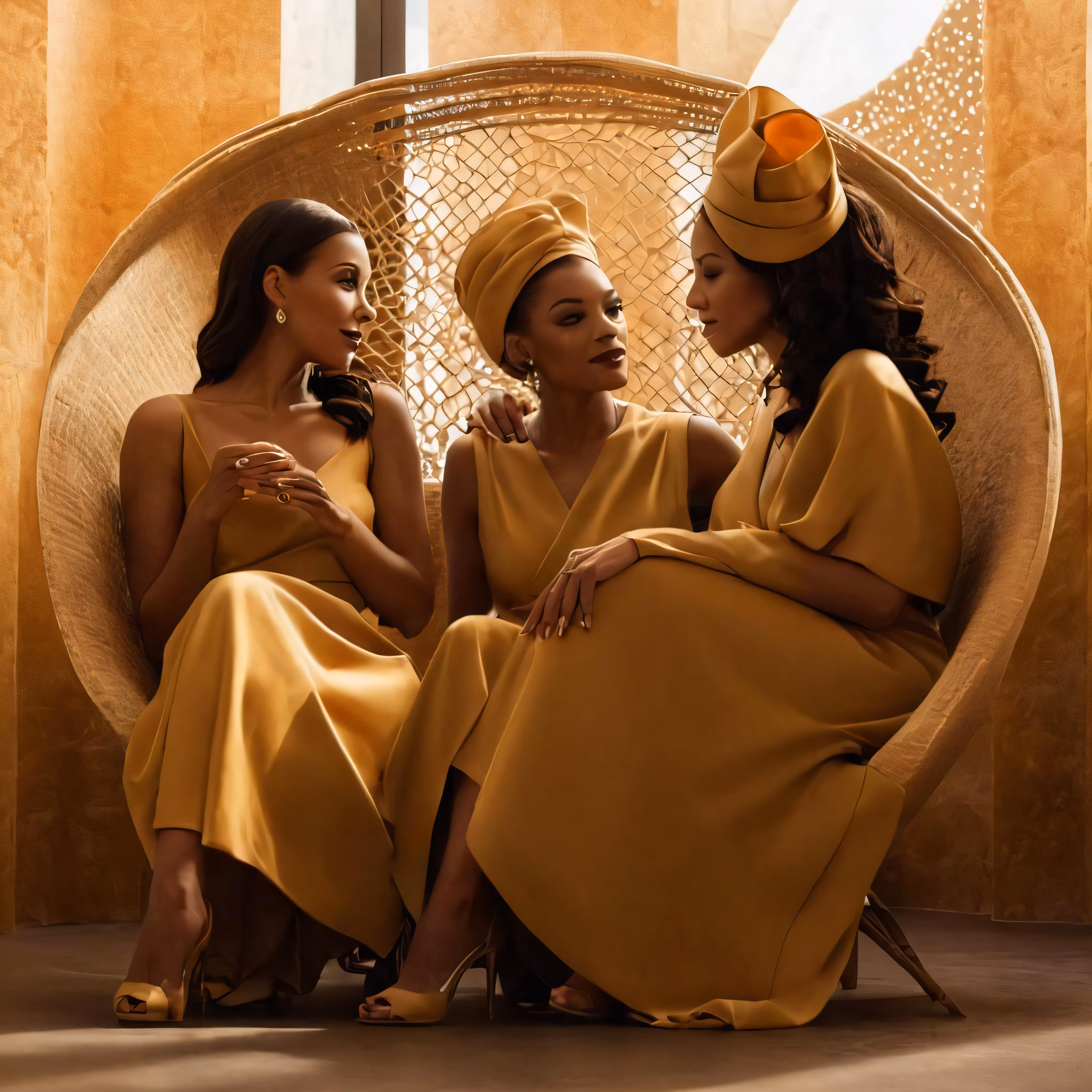High resolution picture, free to use, three women in orange dresses sitting on chairs with hats on