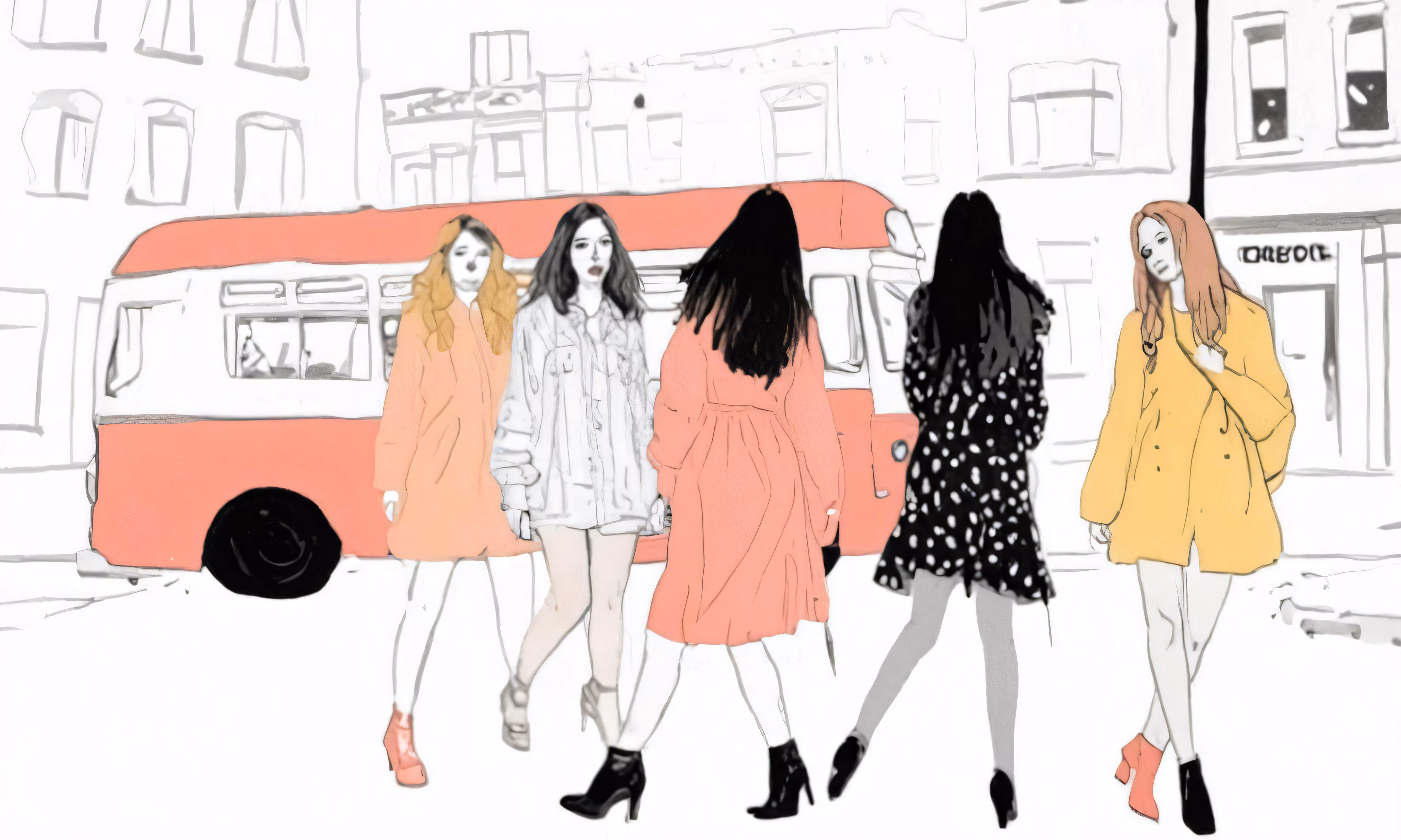 High resolution picture, free to use, three women walking past a red bus in the city