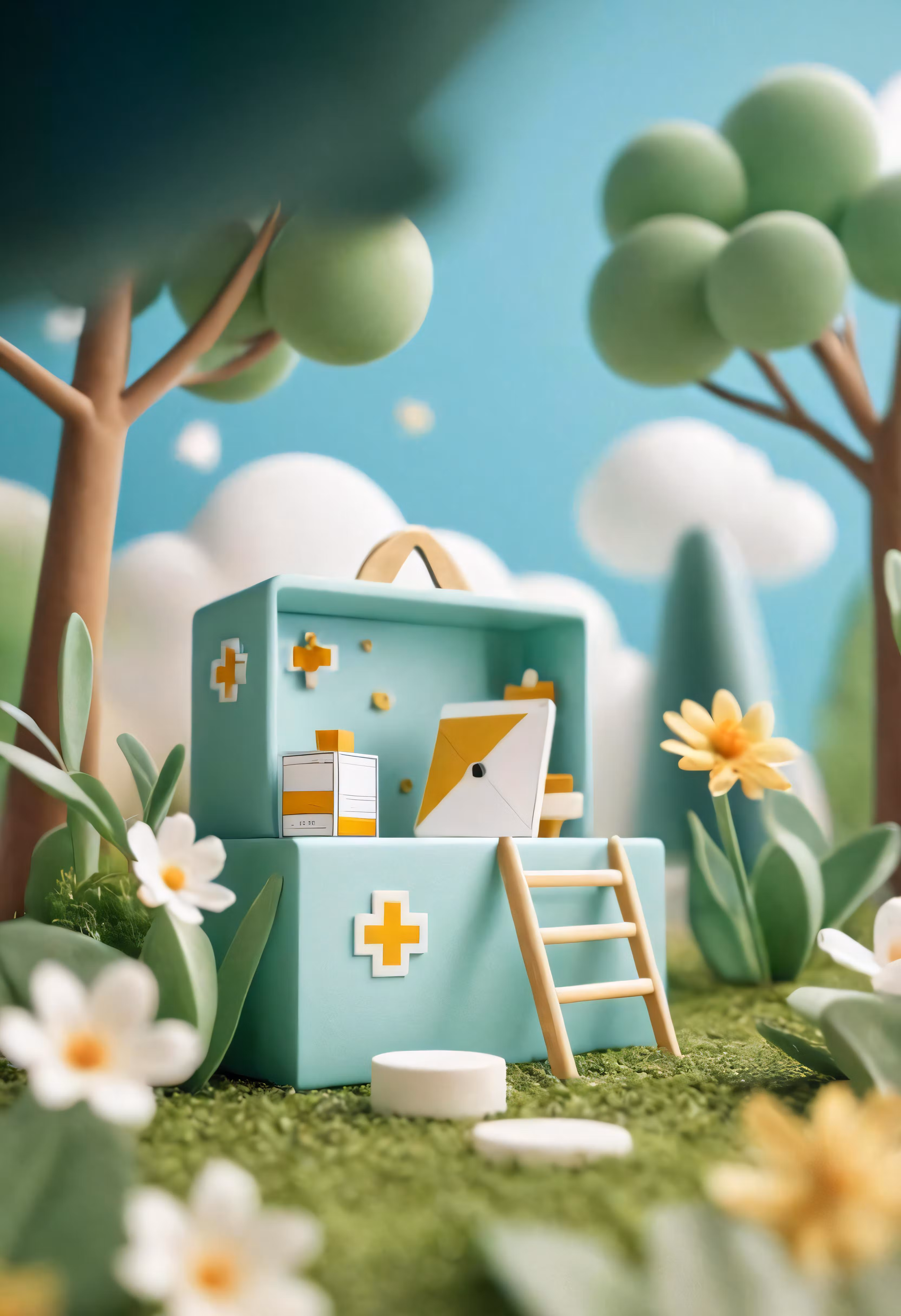 High resolution picture, free to use, toy chest and ladder on grass with flowers, trees and clouds