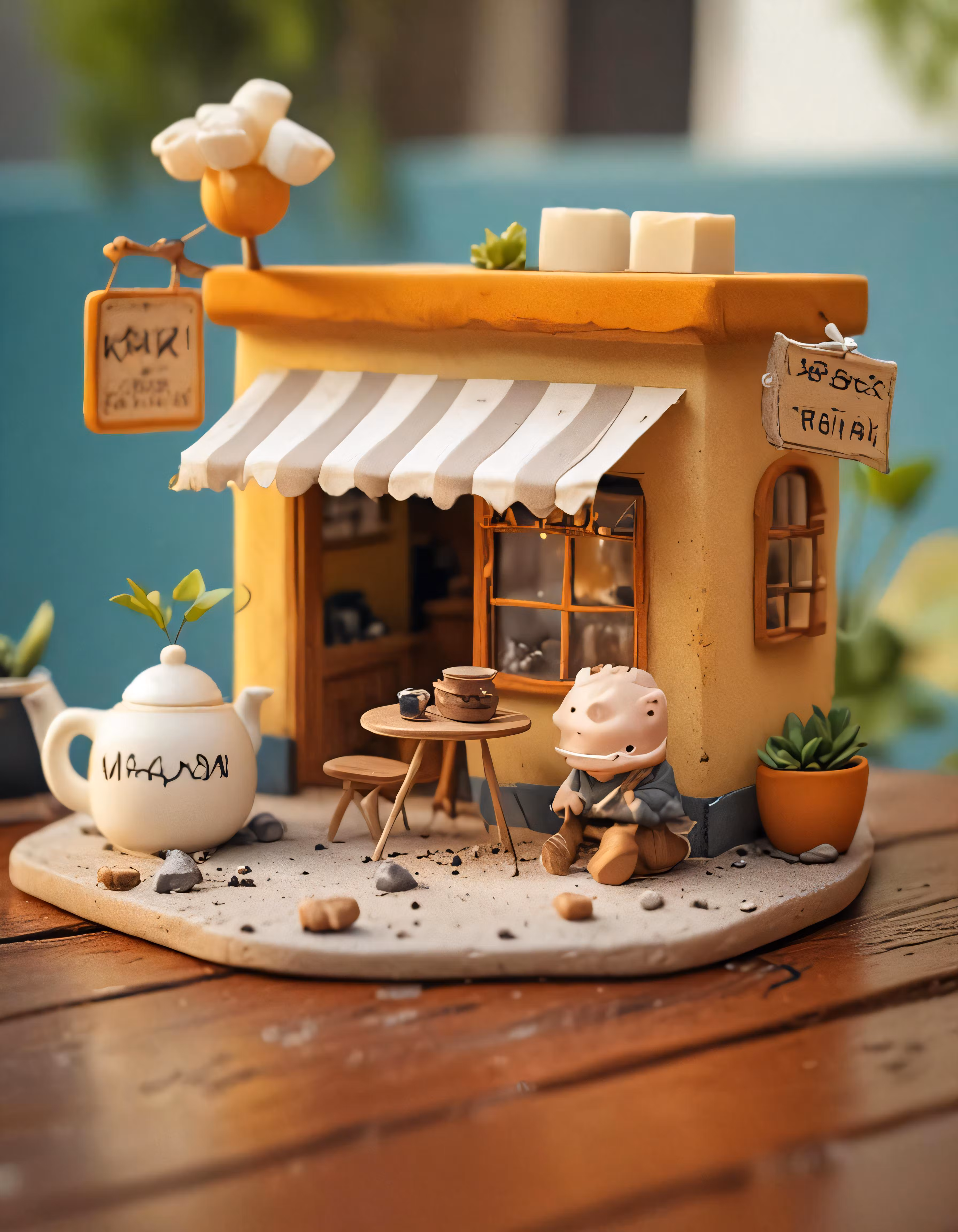 High resolution picture, free to use, toy house, a potted plant and table on wooden surface