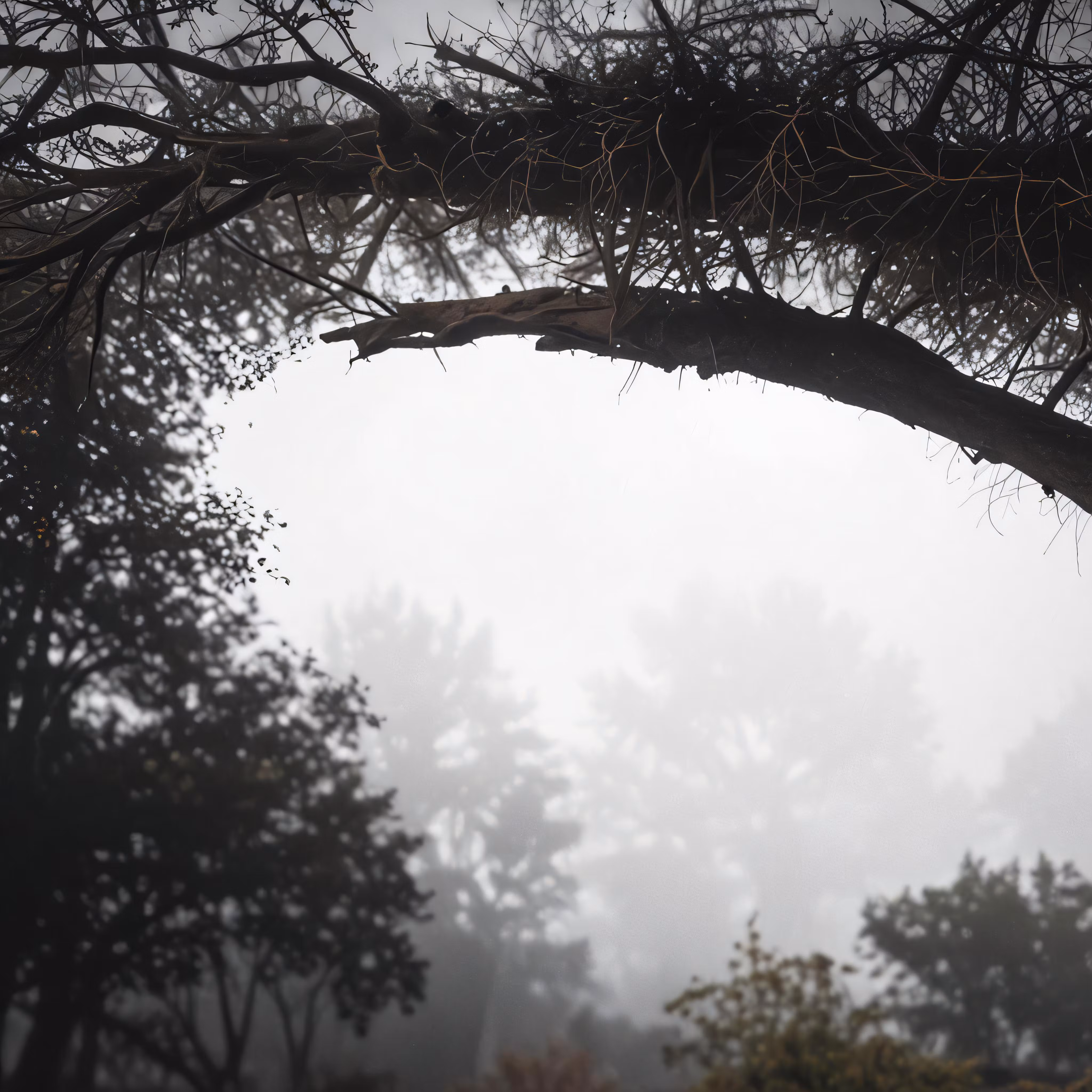 High resolution picture, free to use, tree branches over head in the midst of some fog