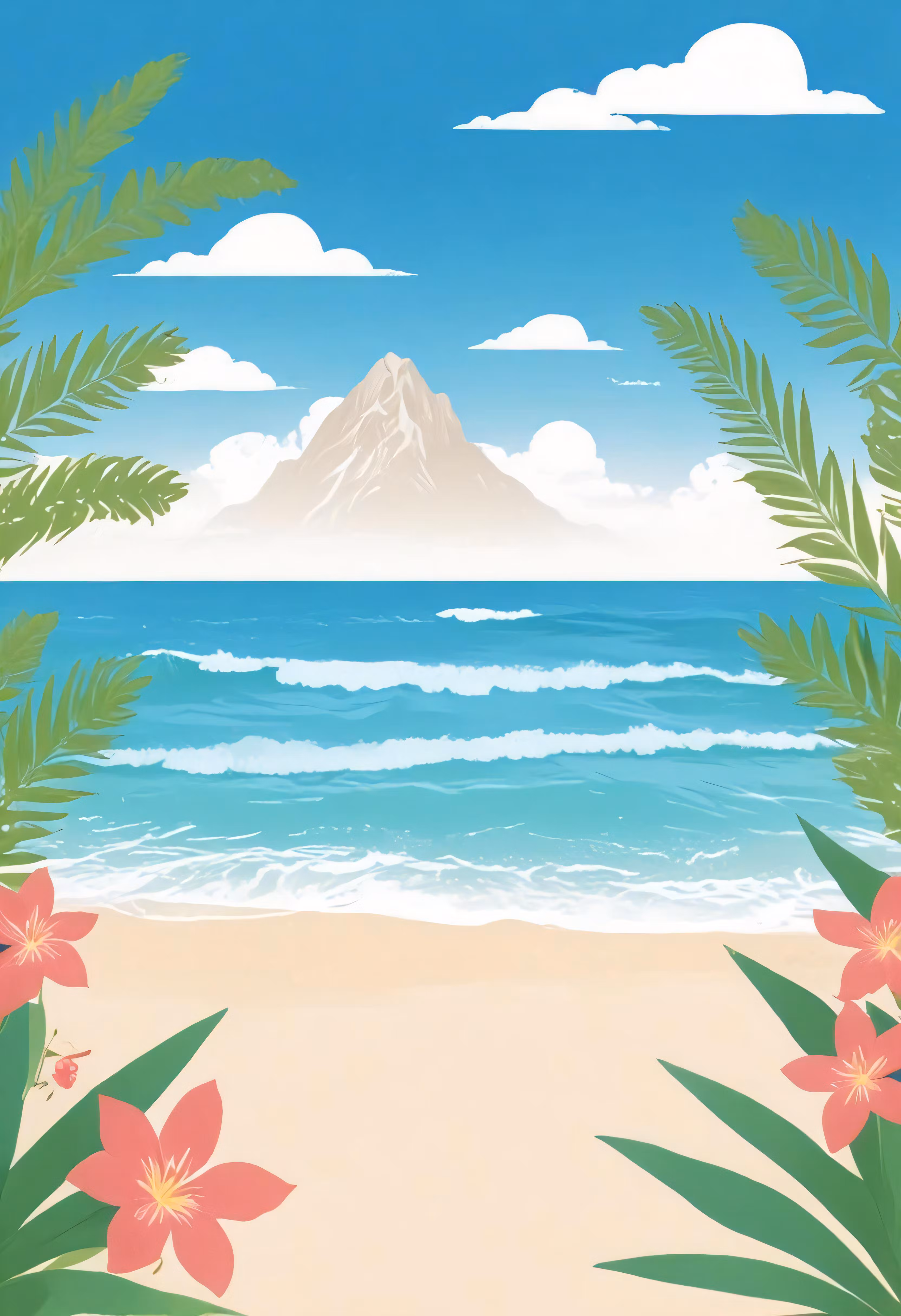 High resolution picture, free to use, tropical landscape view with flowers and beach, a mountain in the background