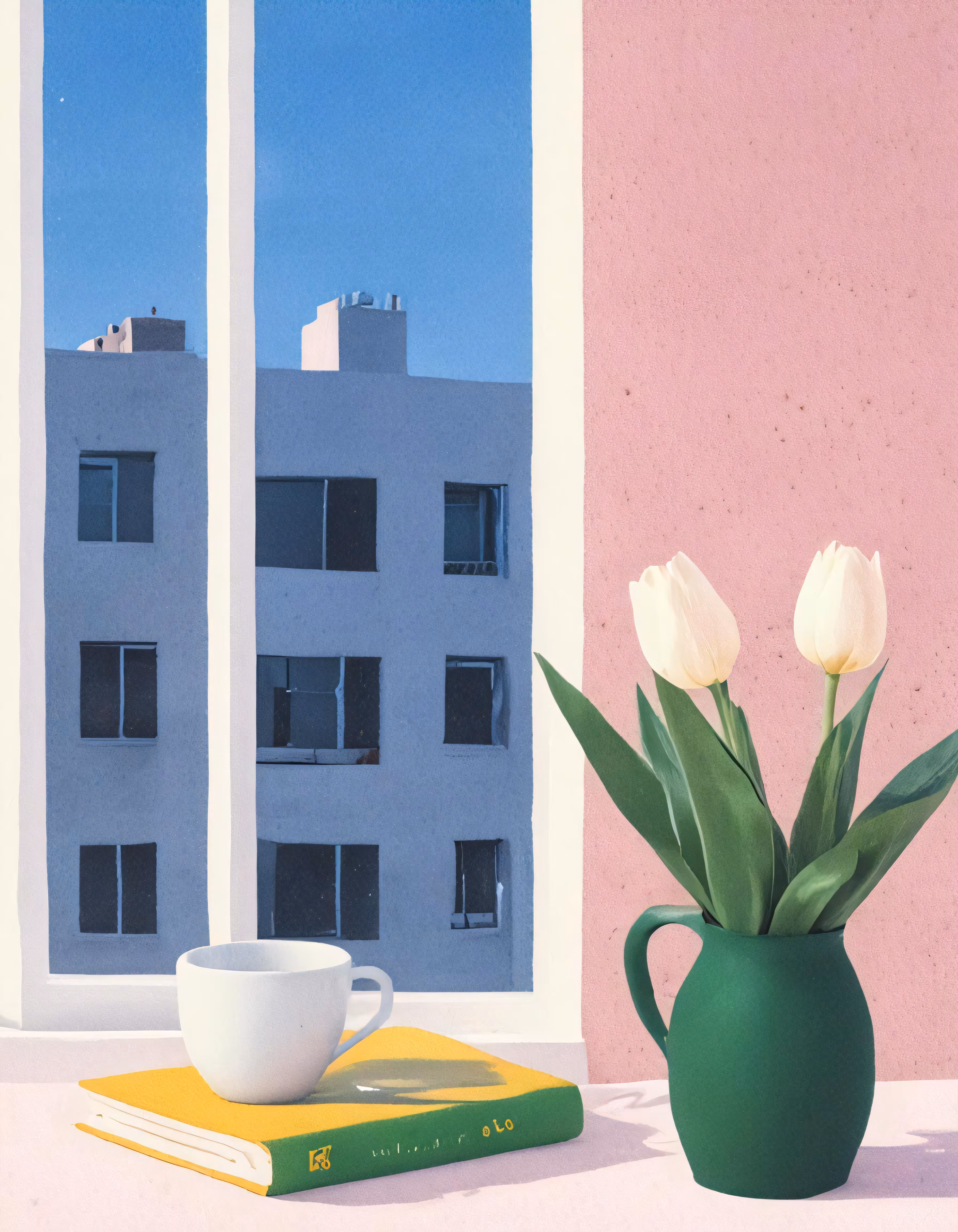 High resolution picture, free to use, tulips in a vase next to a coffee mug on a table near windows