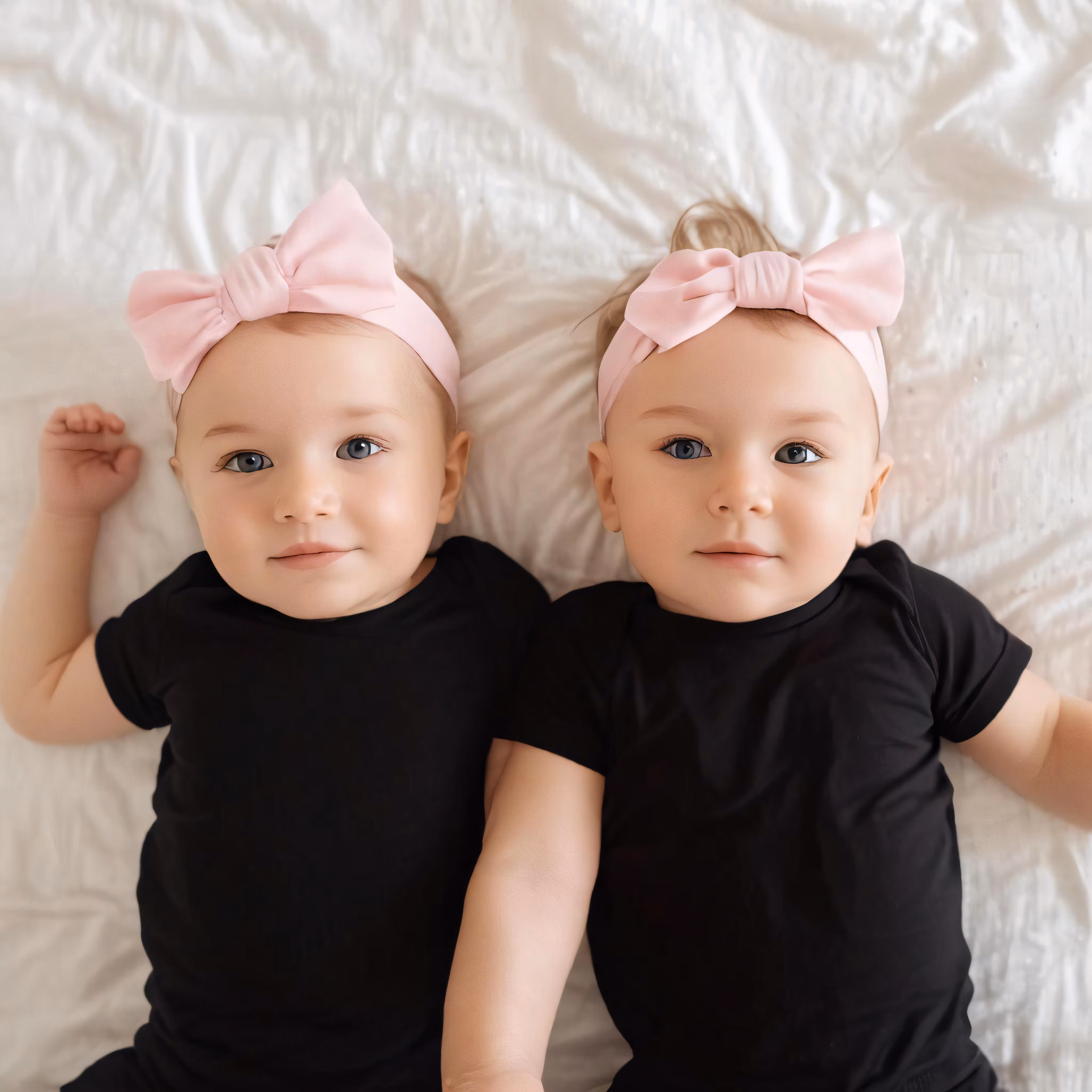 High resolution picture, free to use, two babies lay on a bed with white sheets