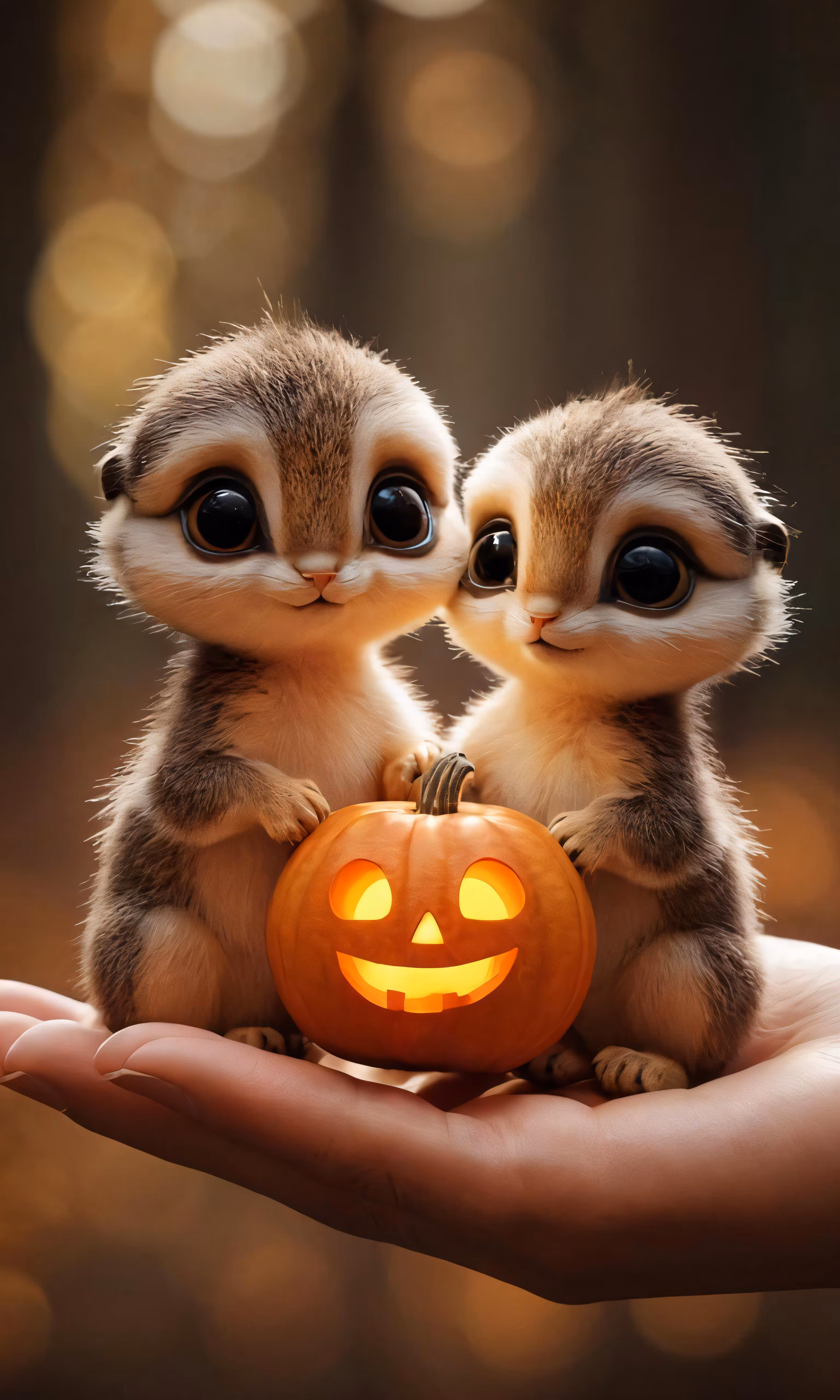 High resolution picture, free to use, two baby brown and white mice sitting in front of a carved jack   o   lantern