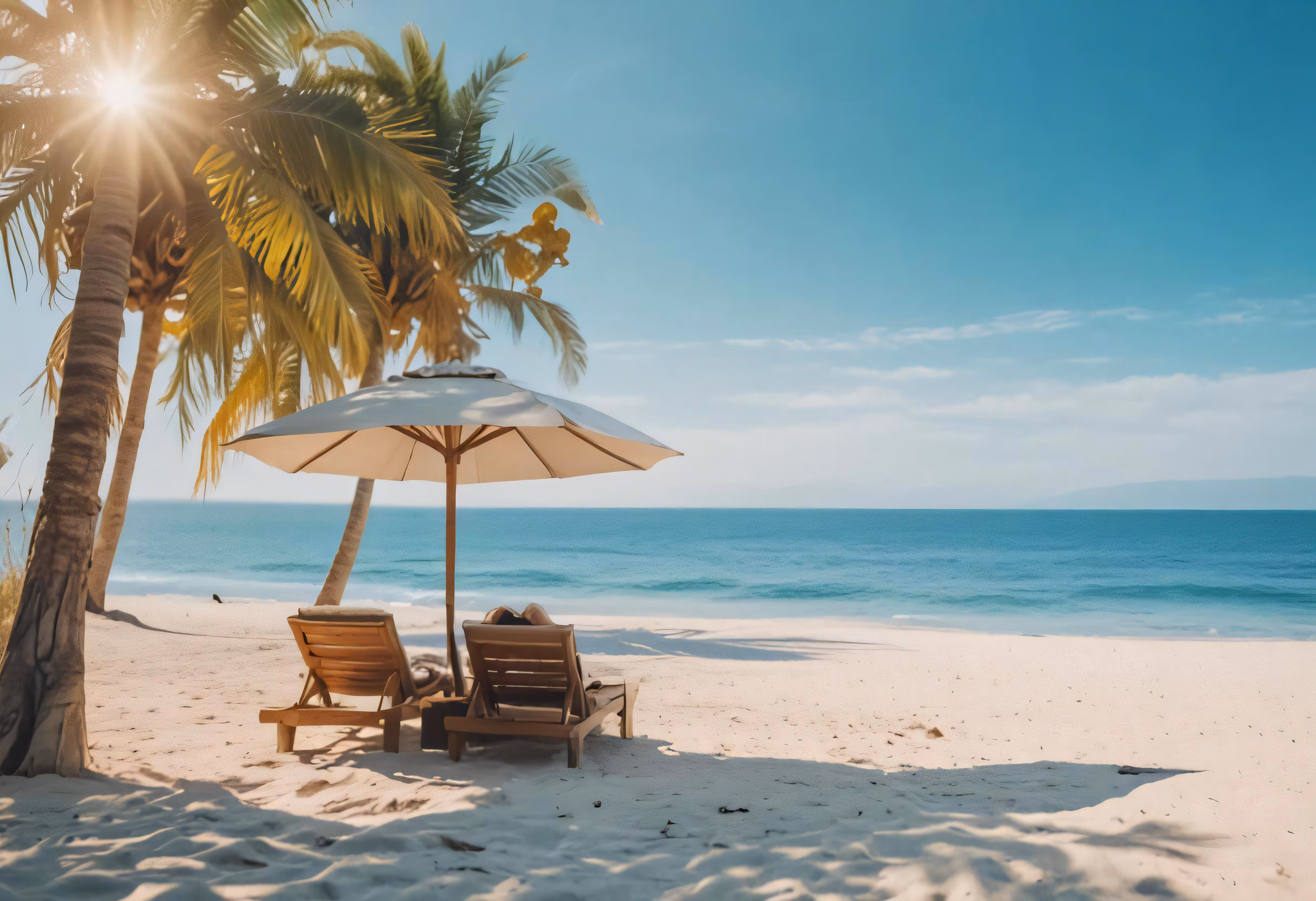 High resolution picture, free to use, two beach chairs and umbrellas sit at the shore of a tropical beach