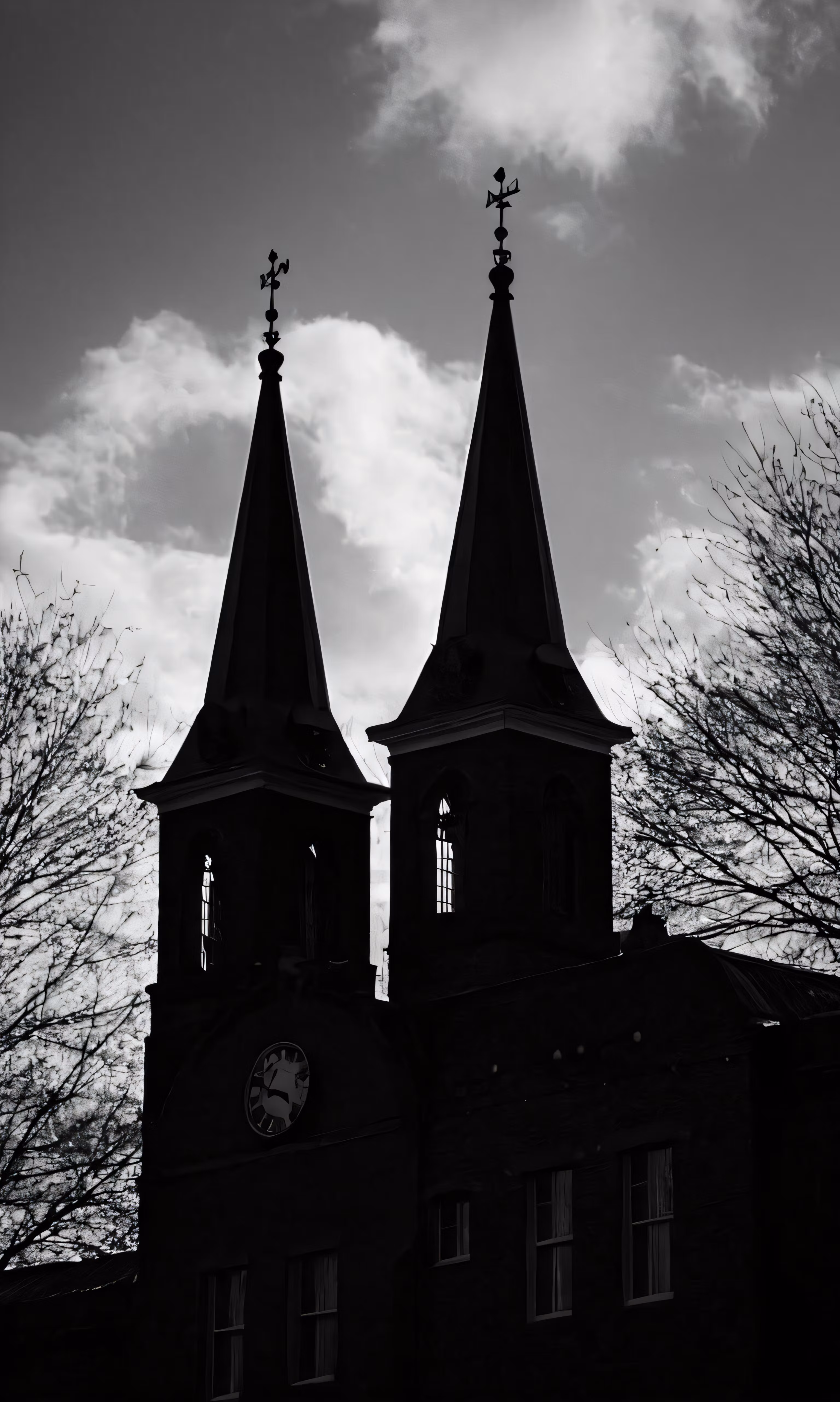 High resolution picture, free to use, two black church towers and a cloudy sky