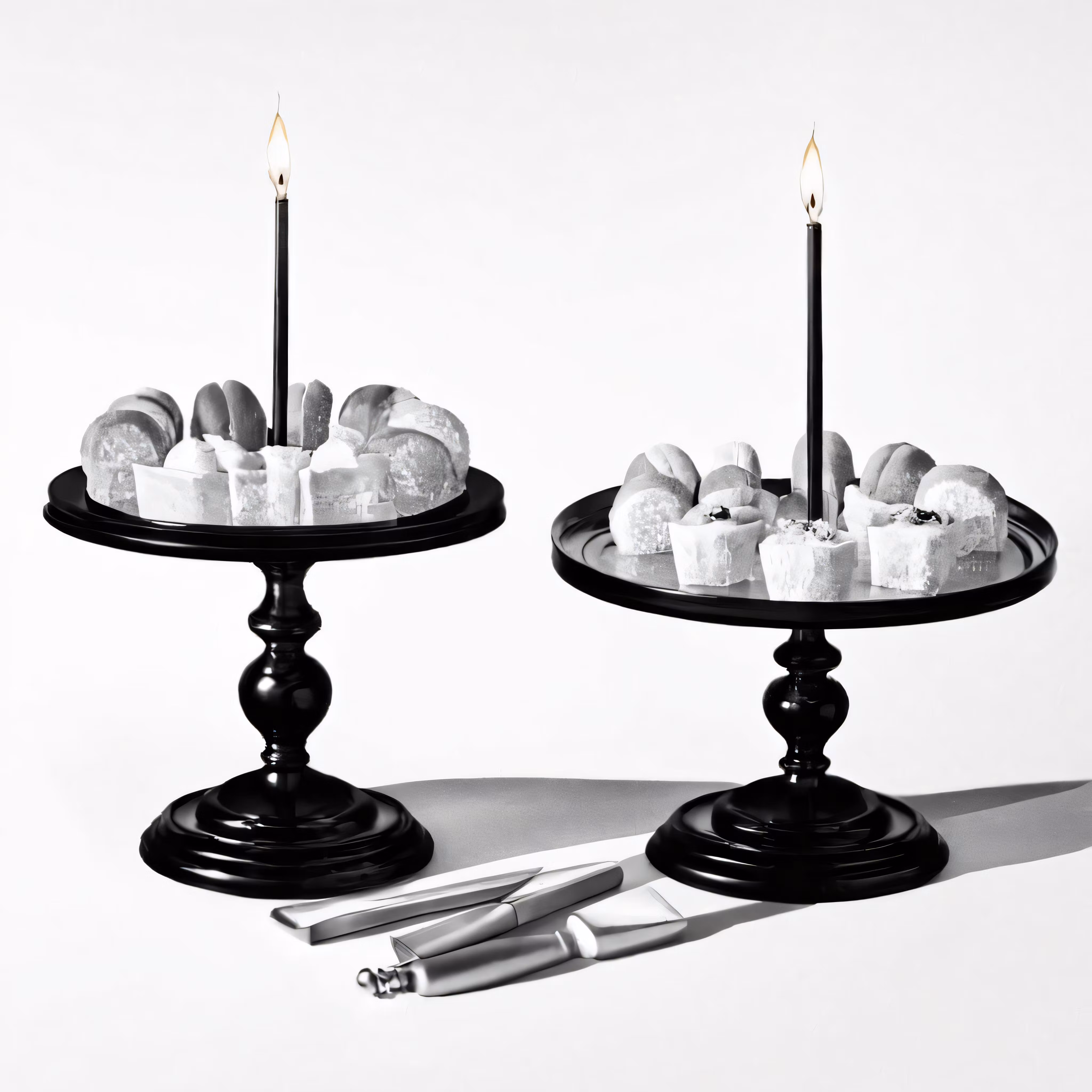High resolution picture, free to use, two cakes are placed on two pedestals with two candles