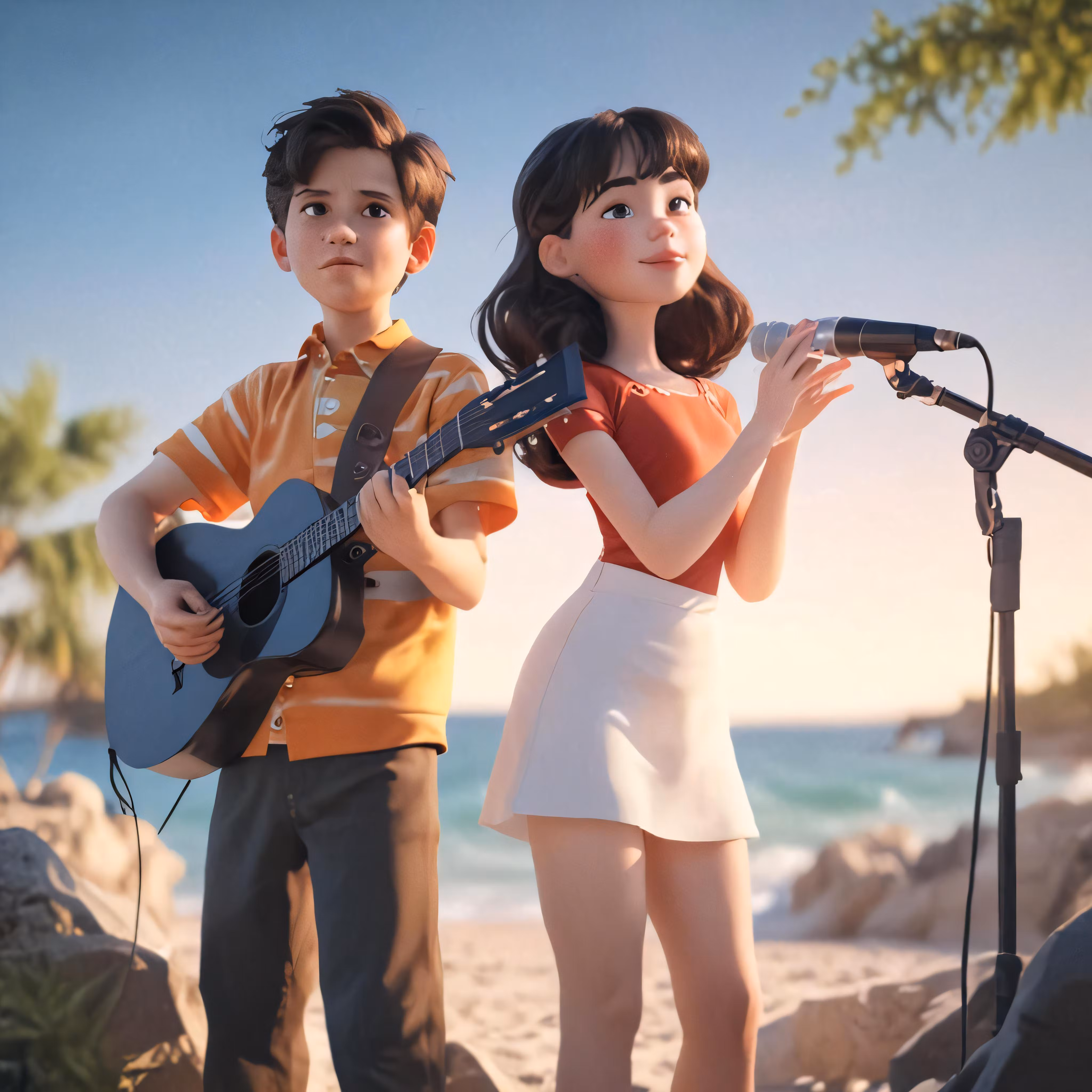 High resolution picture, free to use, two cartoon children, one holding a guitar, the other singing