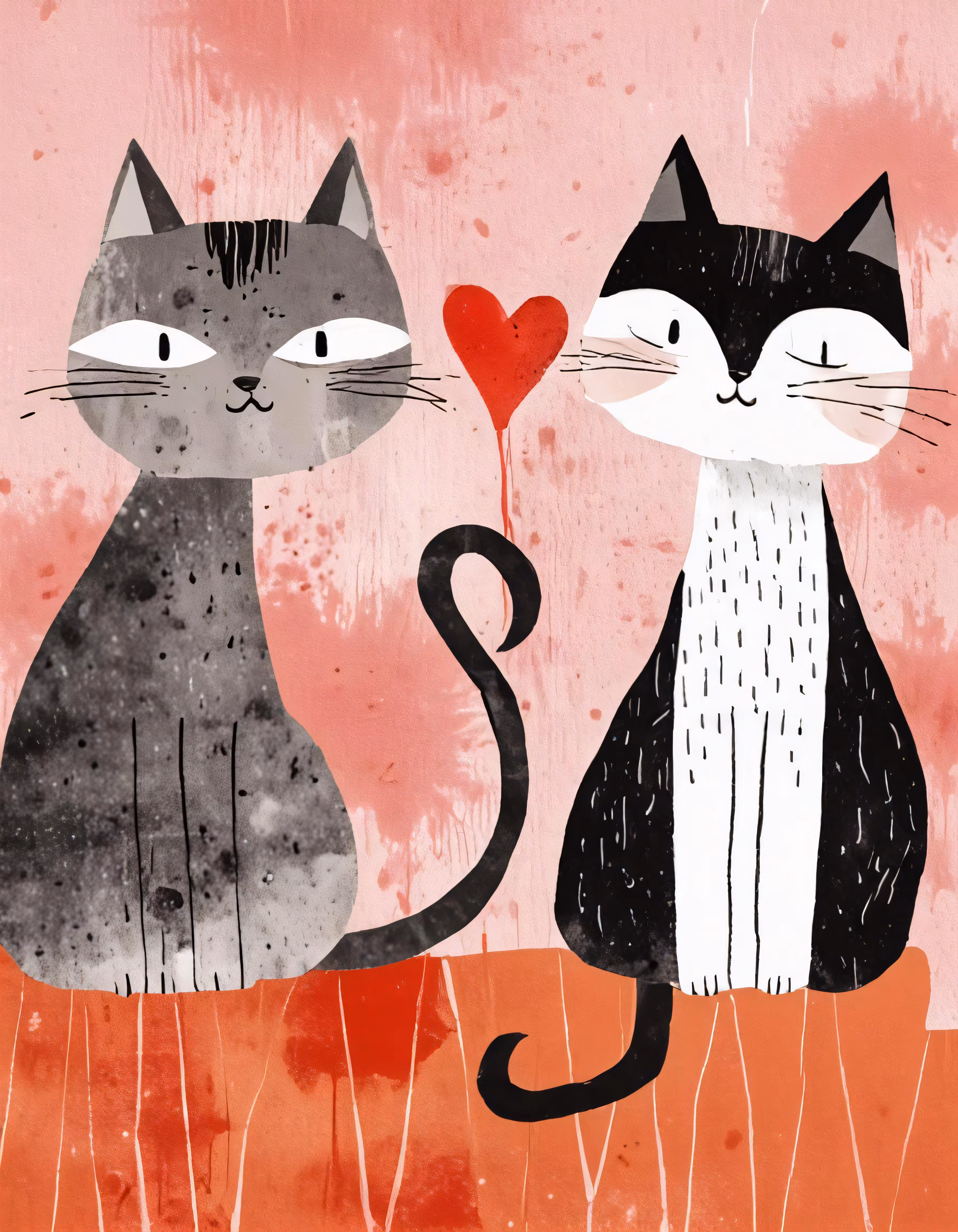 High resolution picture, free to use, two cats standing next to each other, with the cat holding the heart