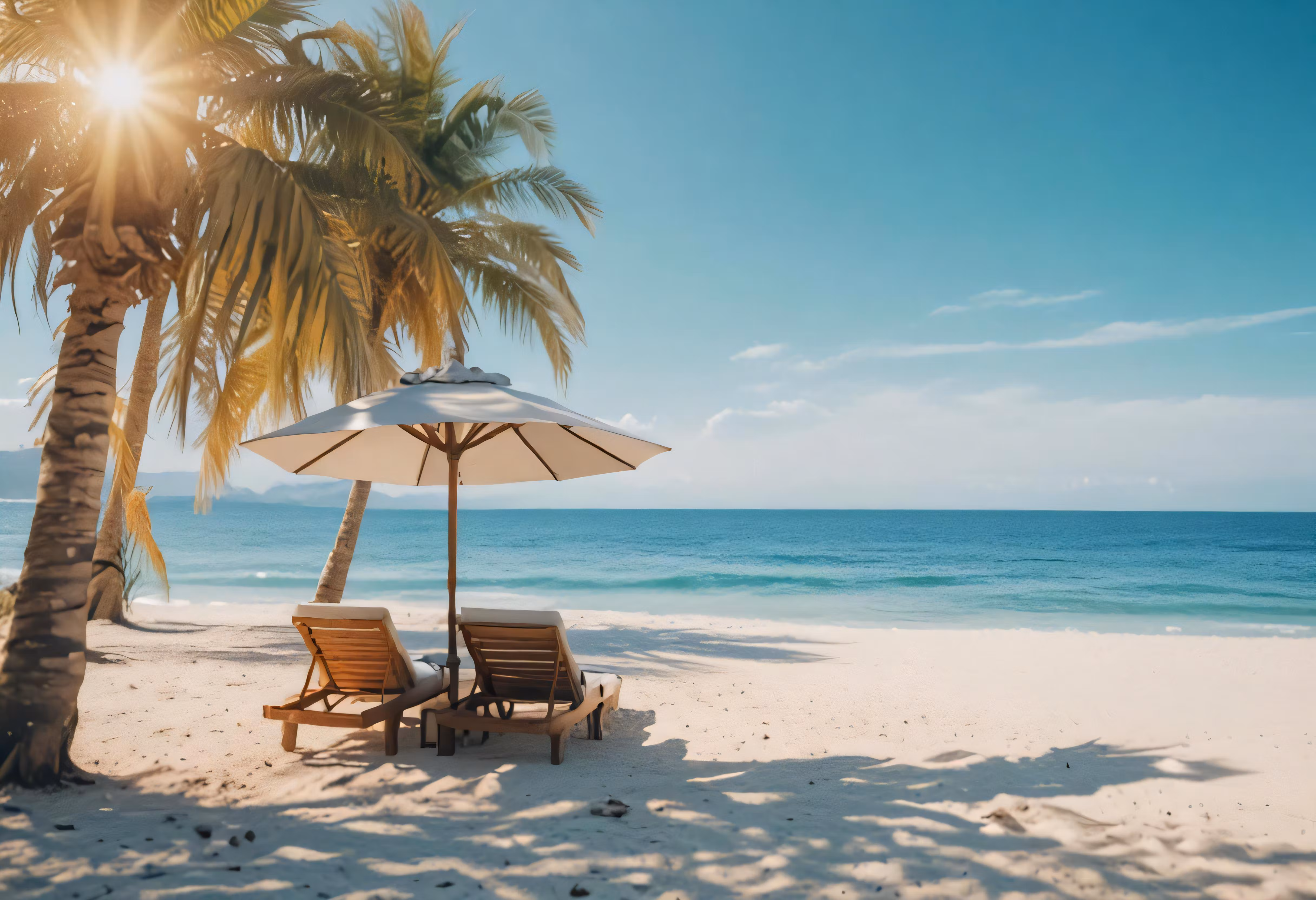 High resolution picture, free to use, two chairs and an umbrella sit on a white sand beach