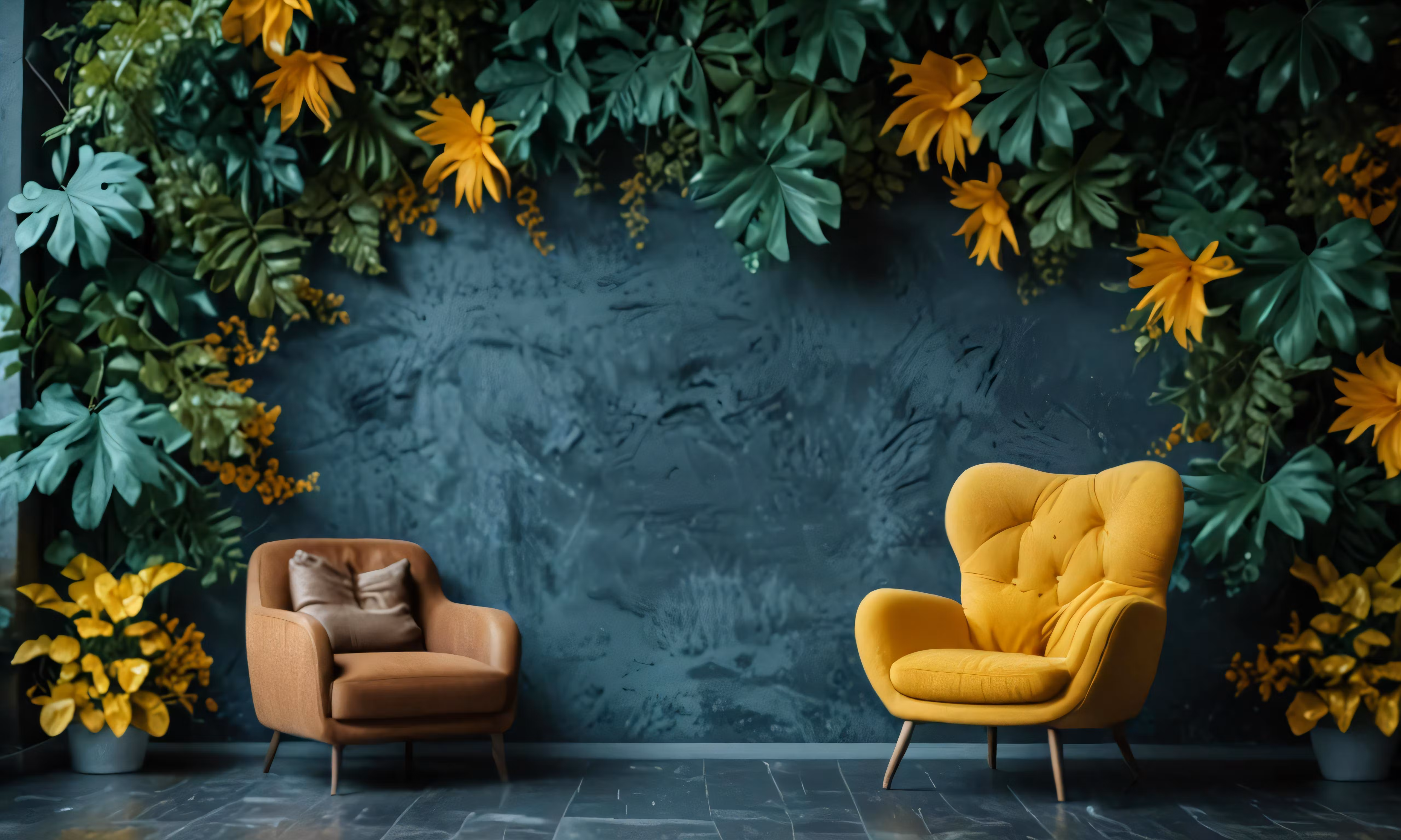 High resolution picture, free to use, two chairs are in front of a wall with plants