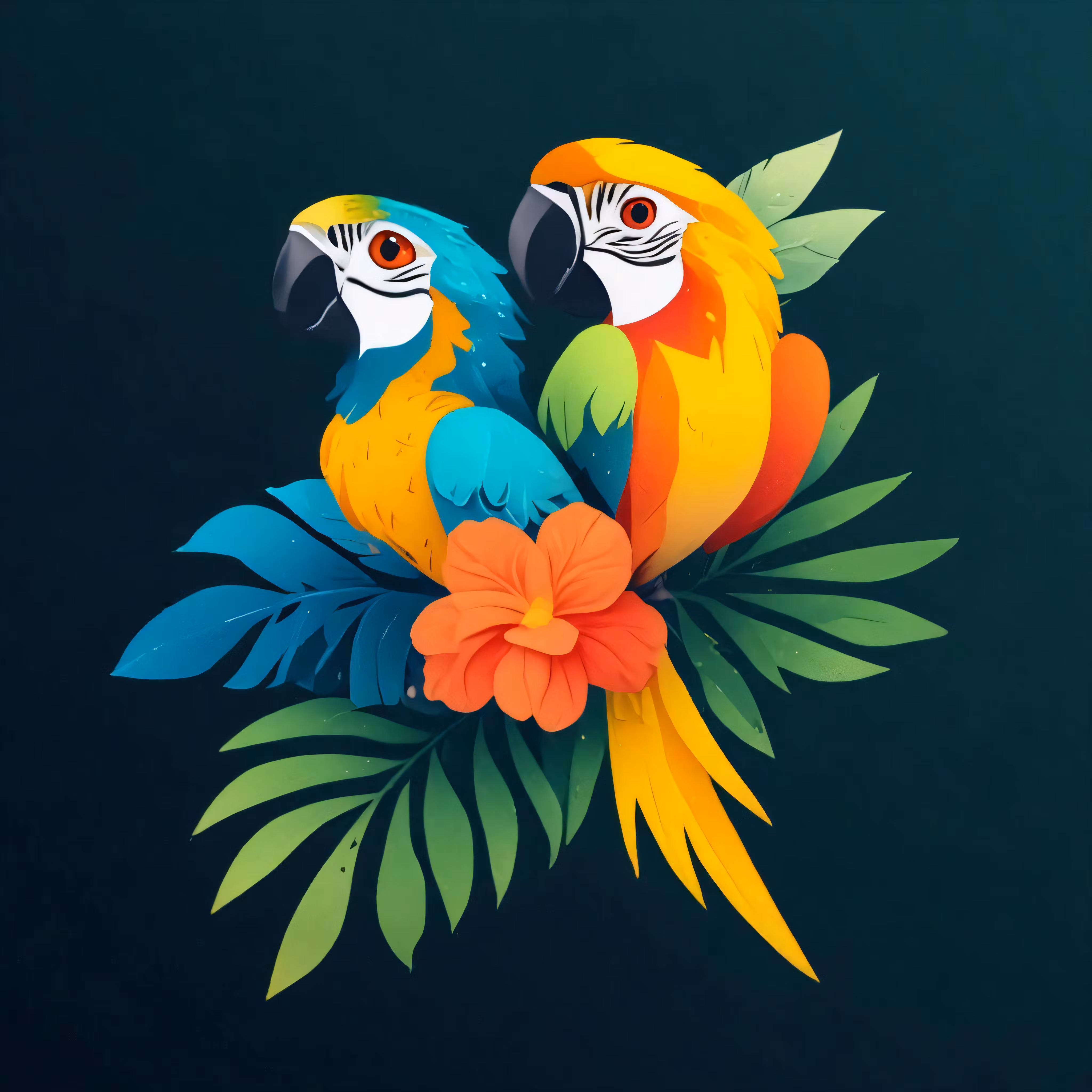 High resolution picture, free to use, two colorful birds perched on a branch with tropical flowers