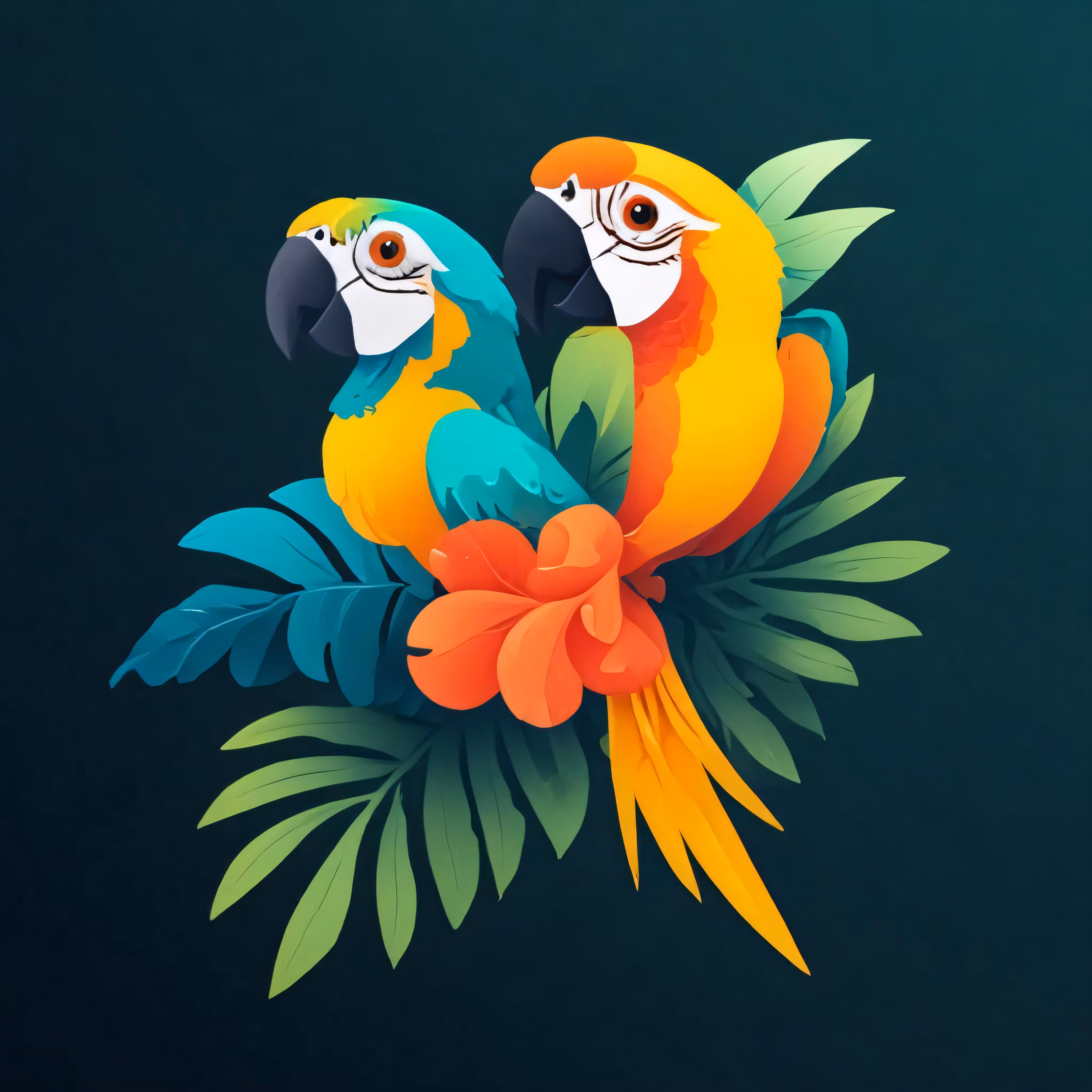 High resolution picture, free to use, two colorful parrots perched on leaves with flower