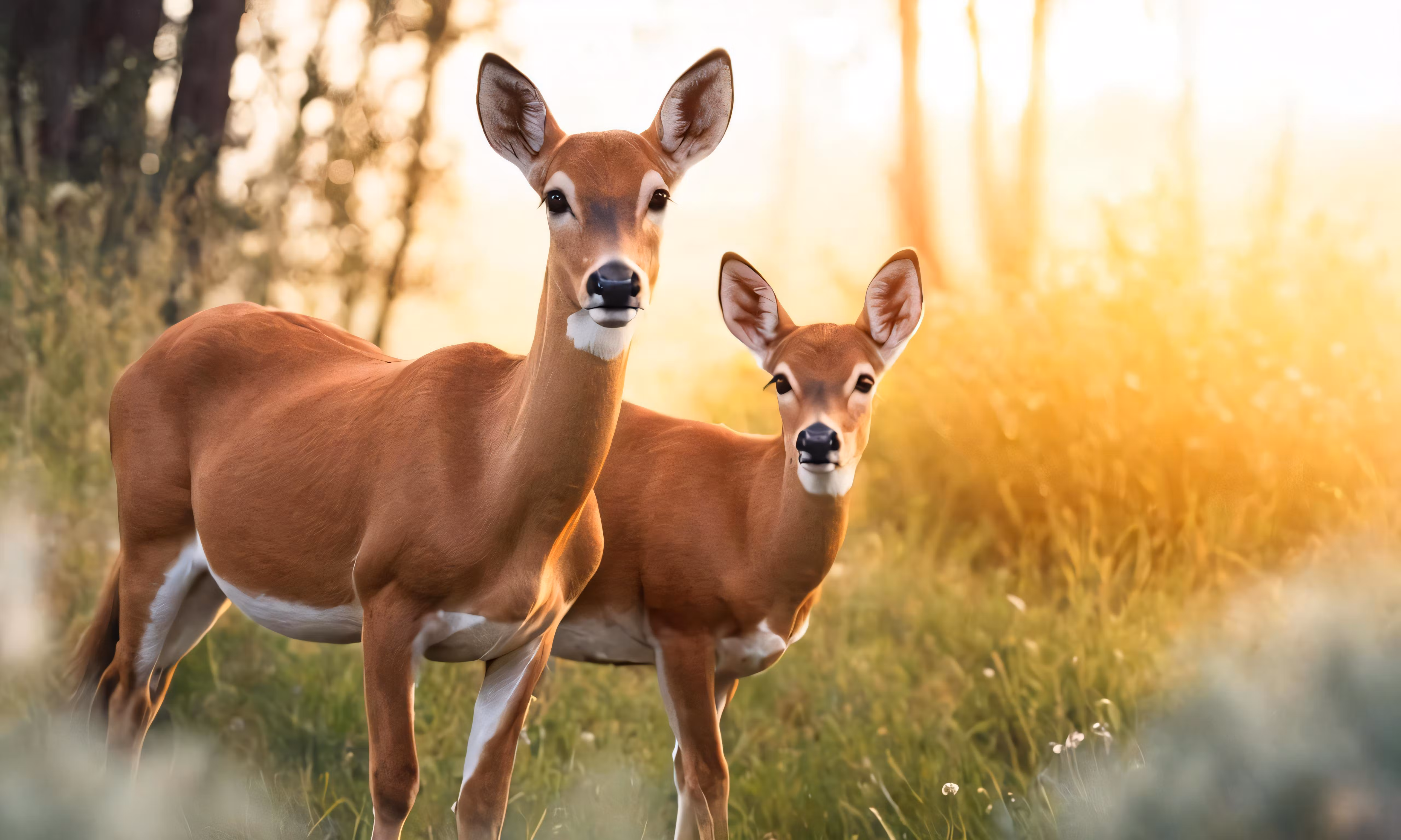 High resolution picture, free to use, two deer standing next to each other on a lush green field