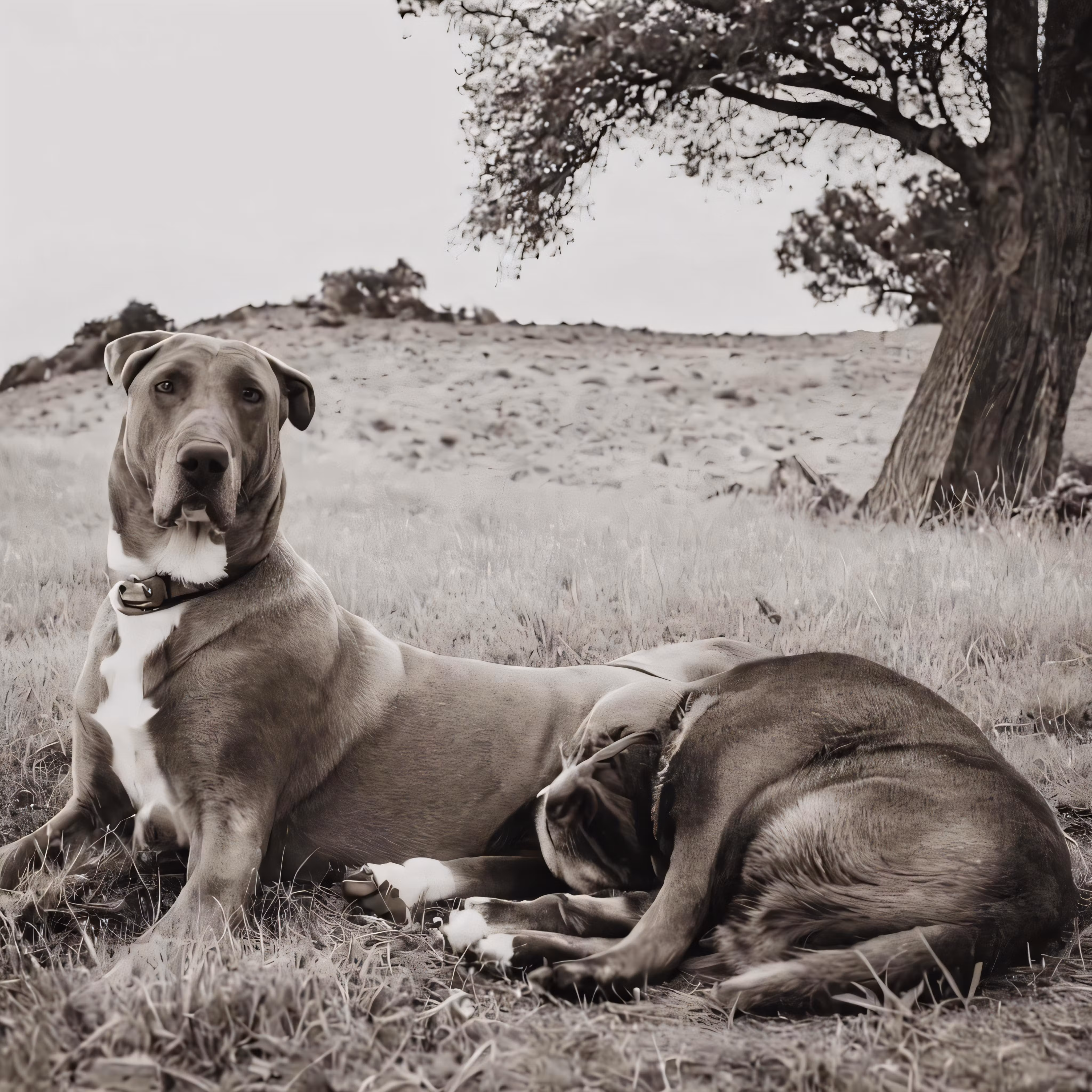 High resolution picture, free to use, two dogs are resting under the tree and in the grass