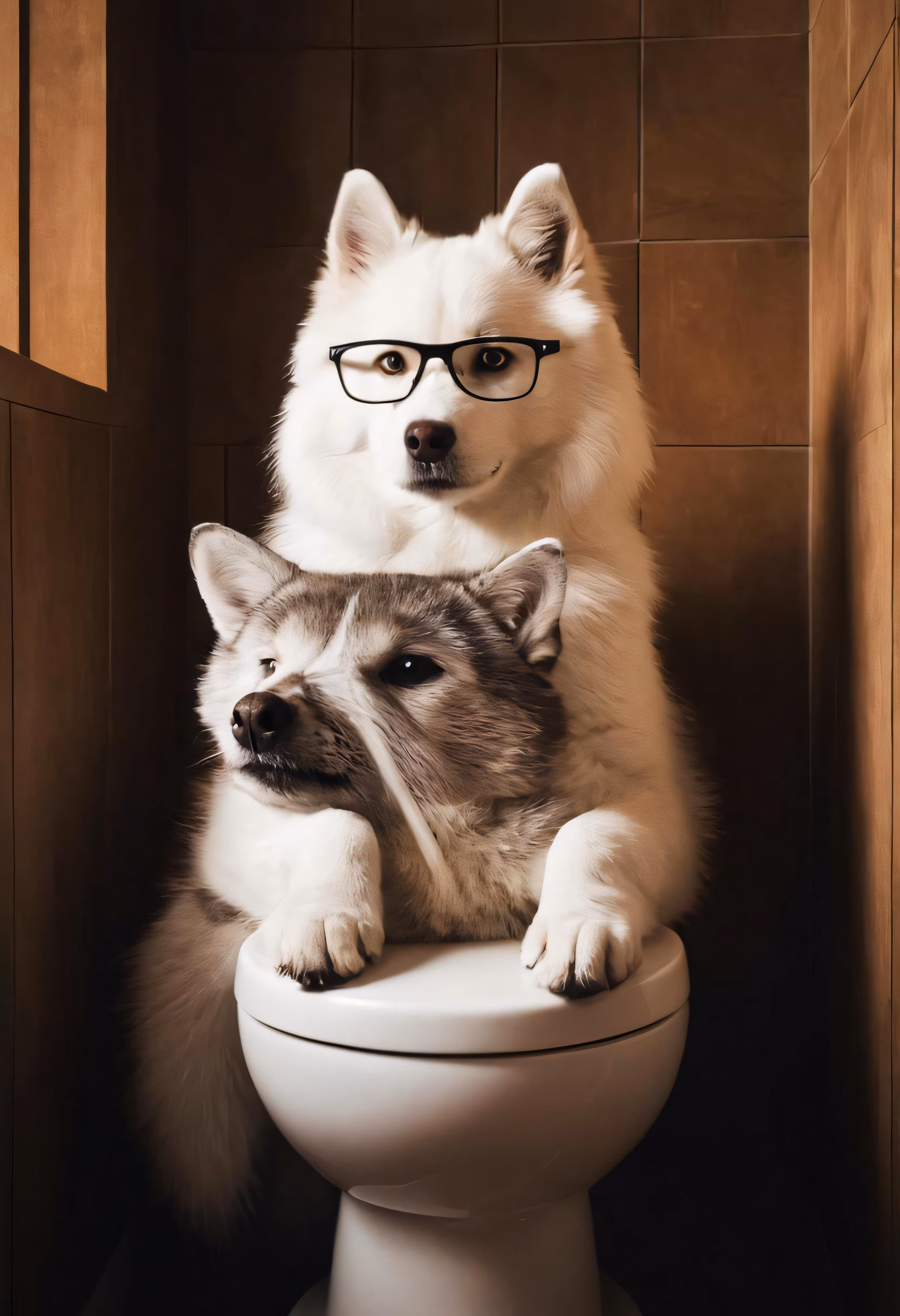 High resolution picture, free to use, two dogs on the toilet have their heads up