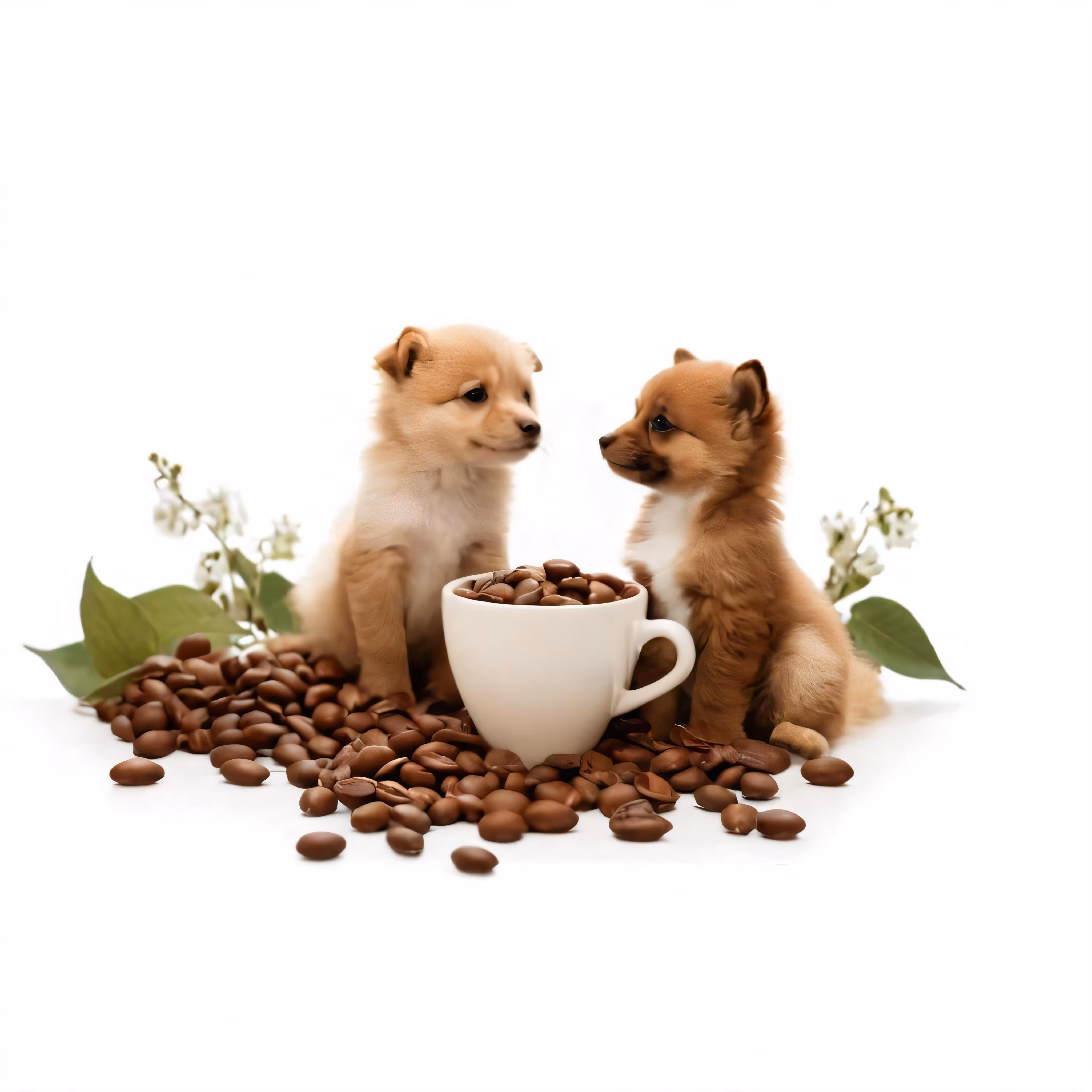 High resolution picture, free to use, two dogs sitting on a pile of beans looking at the ground