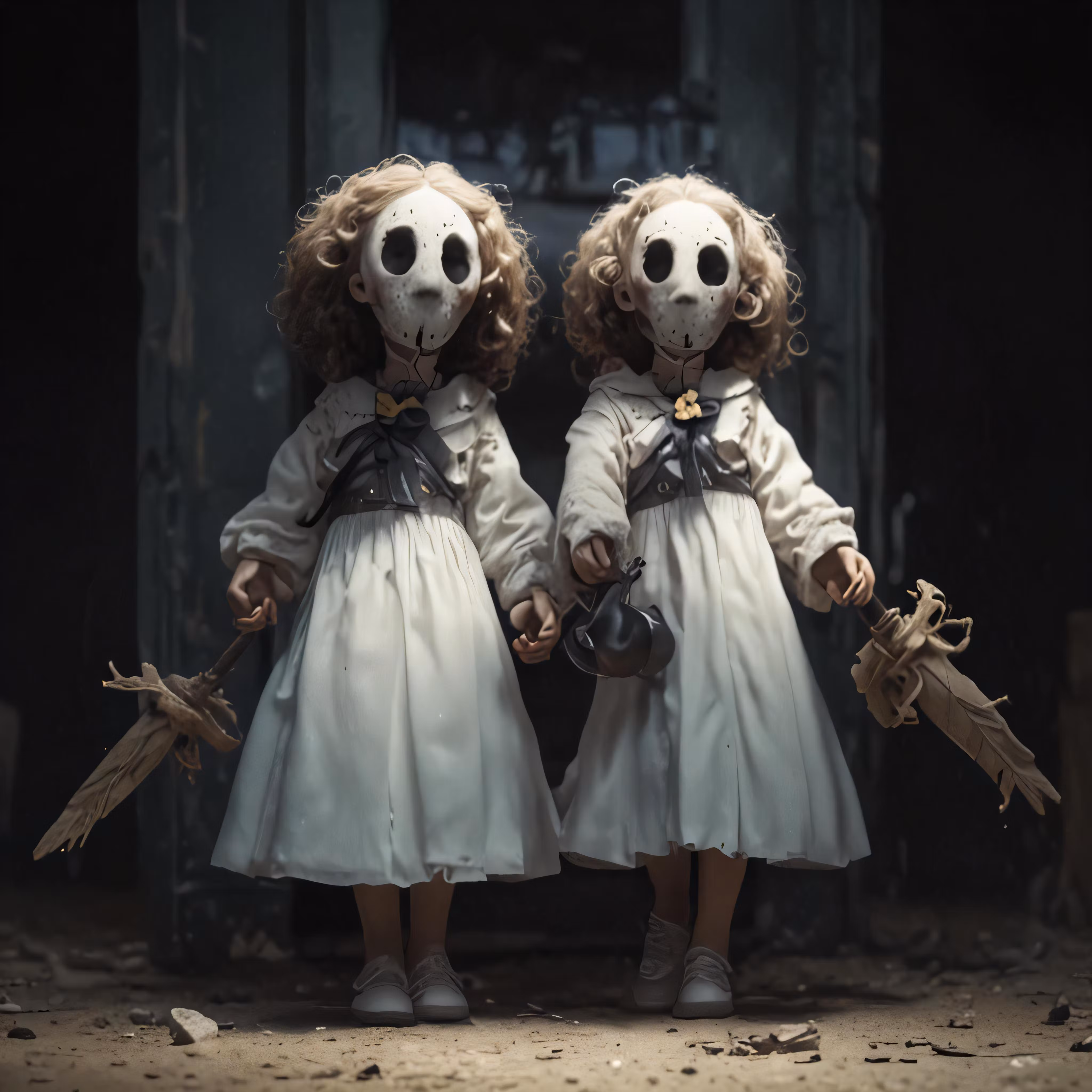 High resolution picture, free to use, two dolls standing side by side, both holding handles