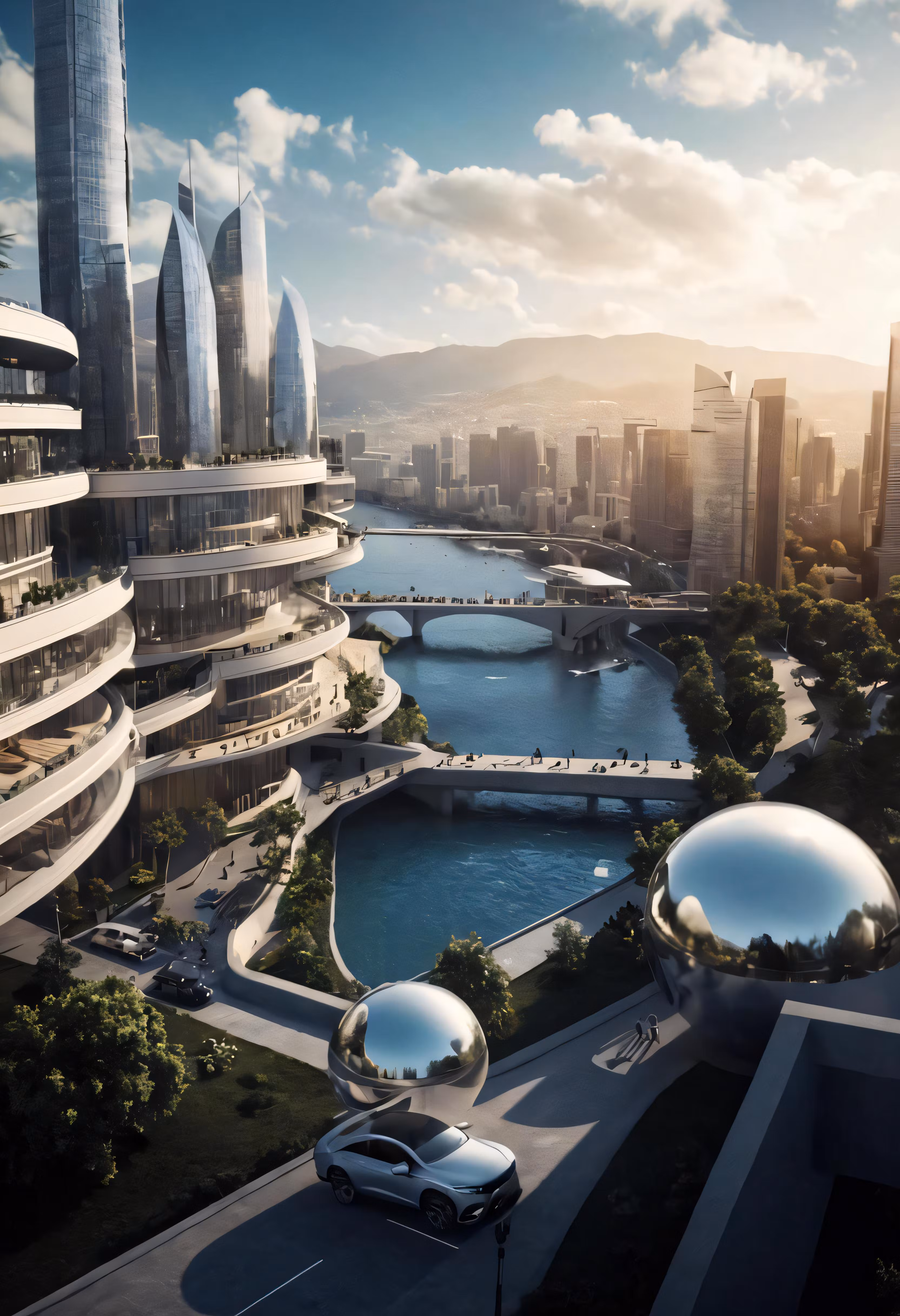 High resolution picture, free to use, two futuristic buildings with large glass domes near a lake