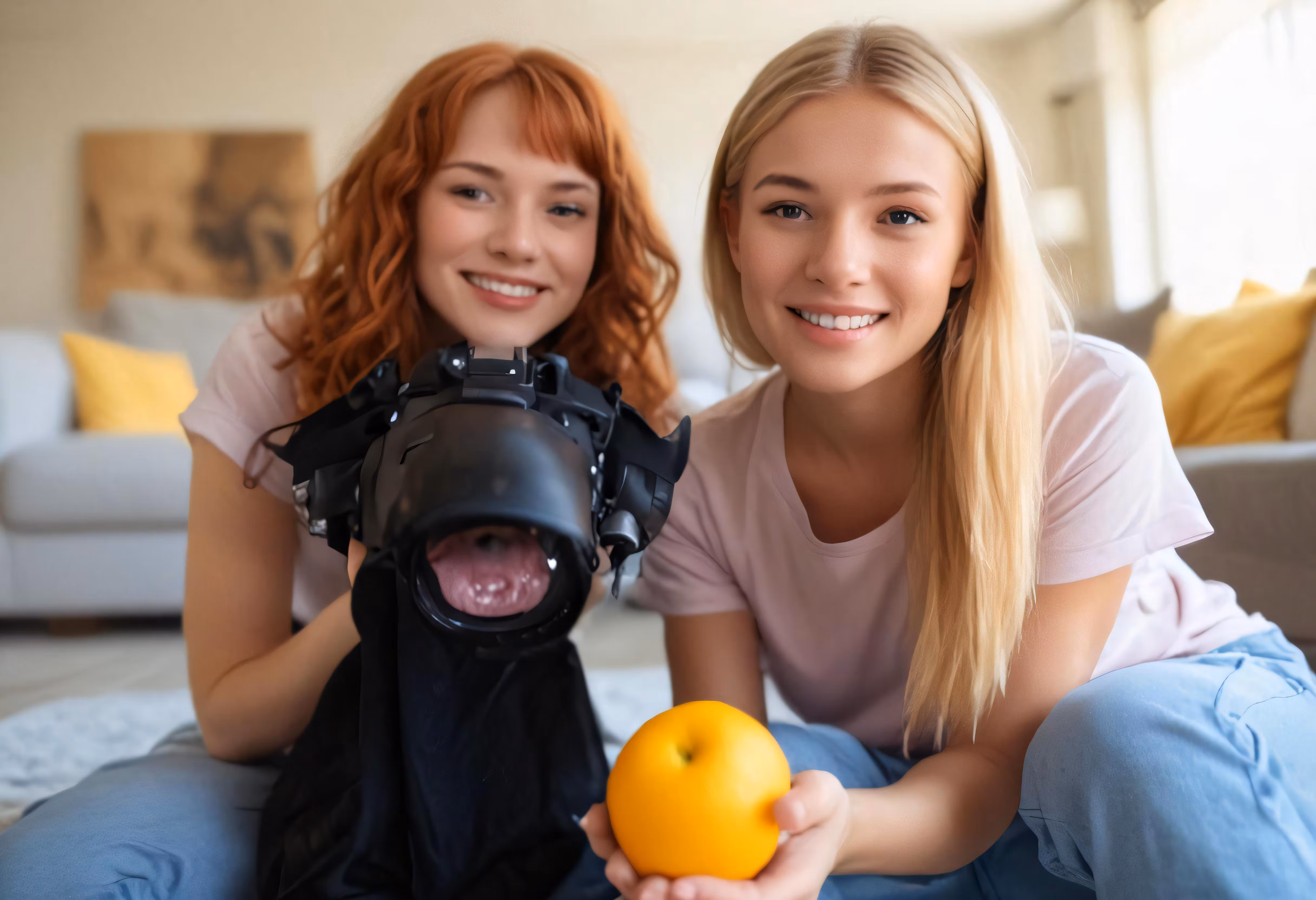 High resolution picture, free to use, two girls sitting on the floor and one holding an orange