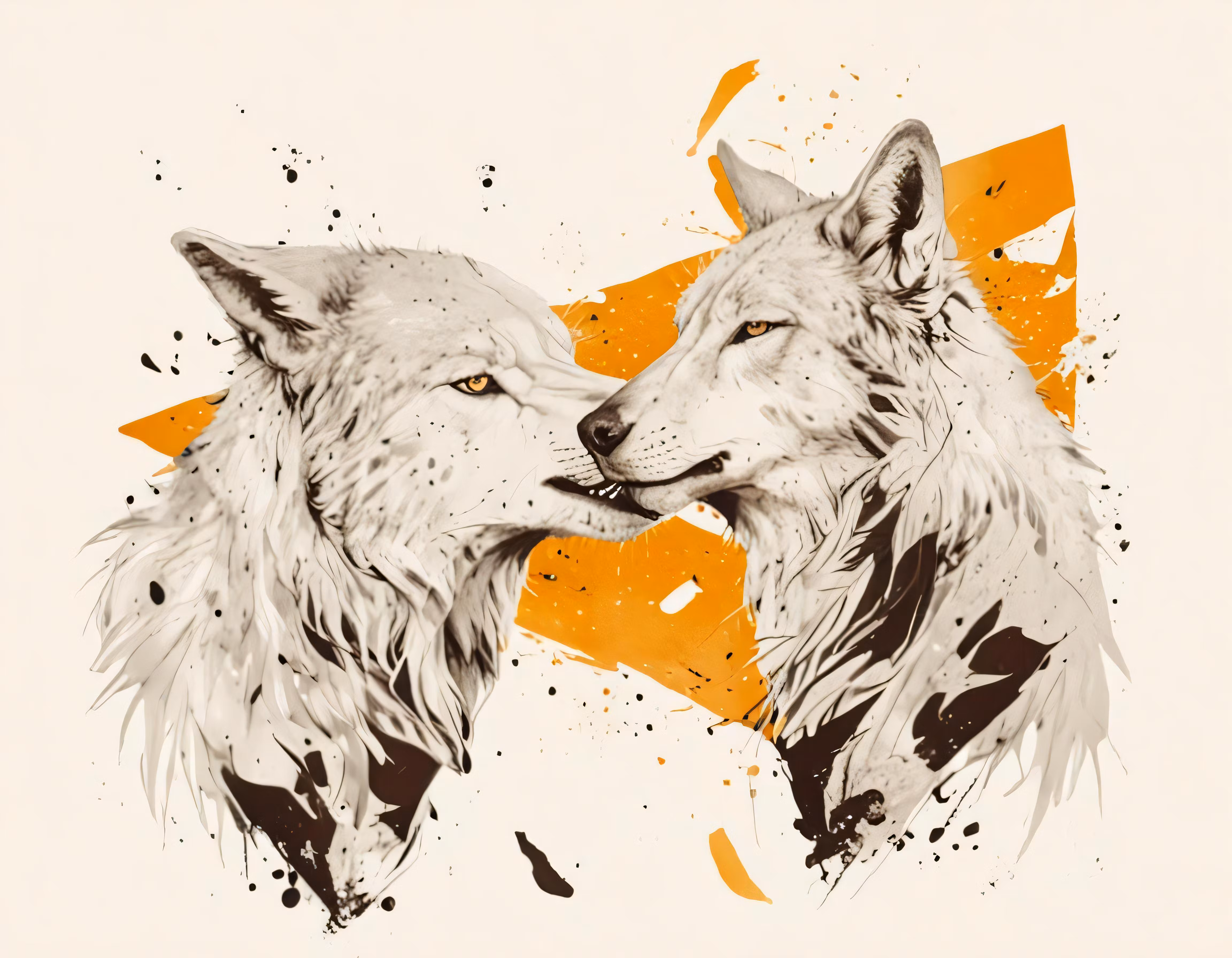 High resolution picture, free to use, two gray and white wolfs in front of an orange triangle