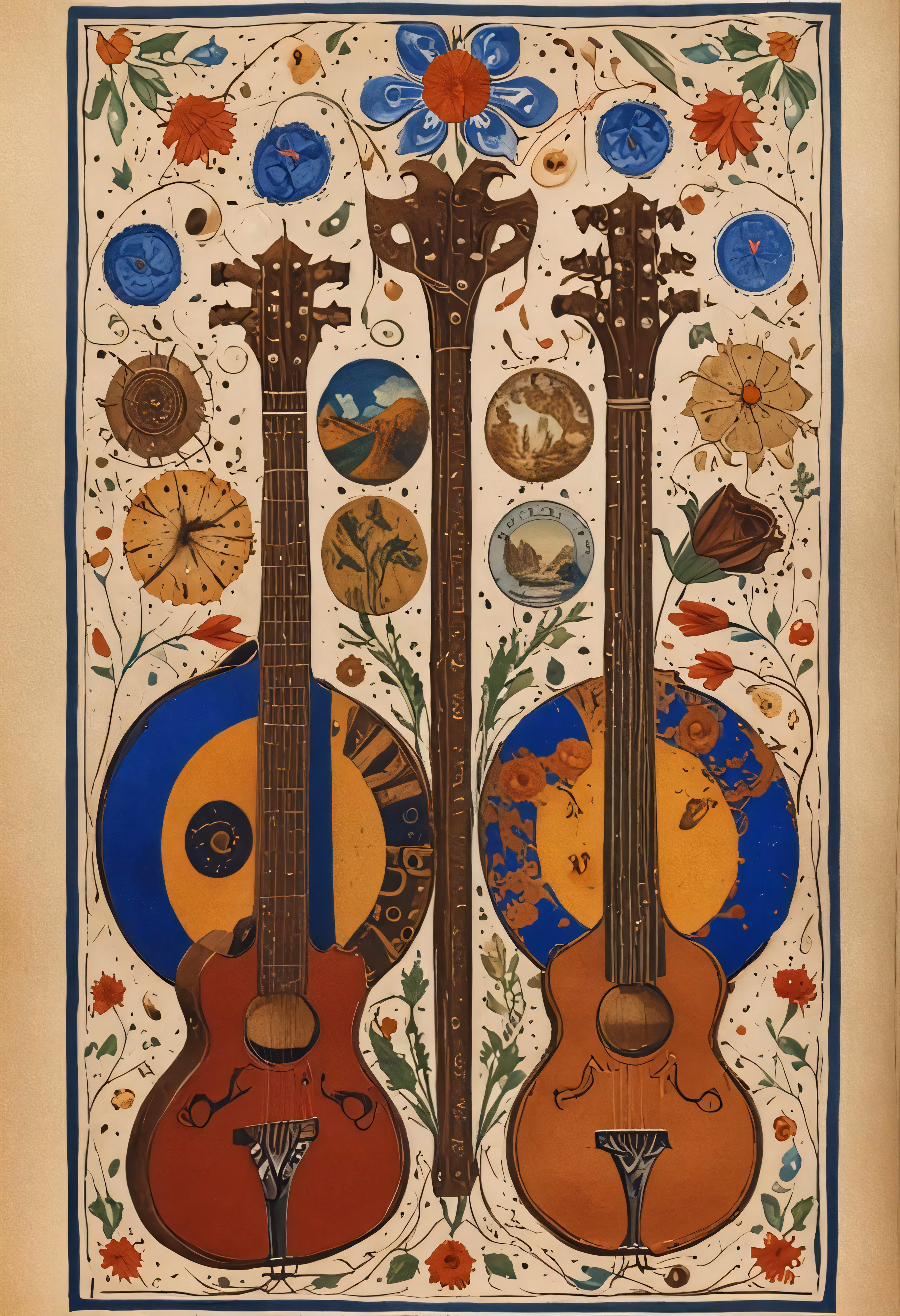 High resolution picture, free to use, two guitars and clocks sit on a paper