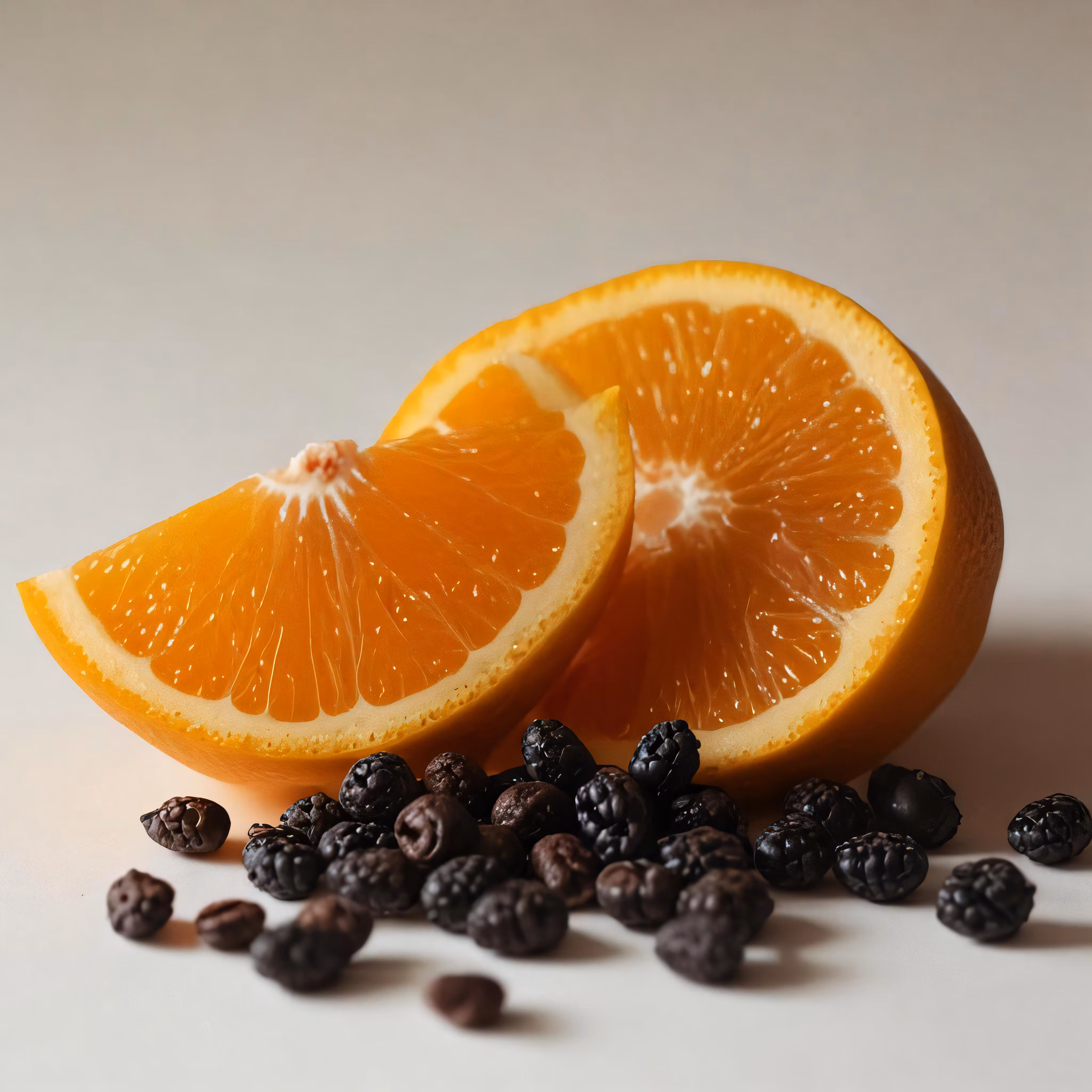 High resolution picture, free to use, two halves of an orange are seen with blackberries