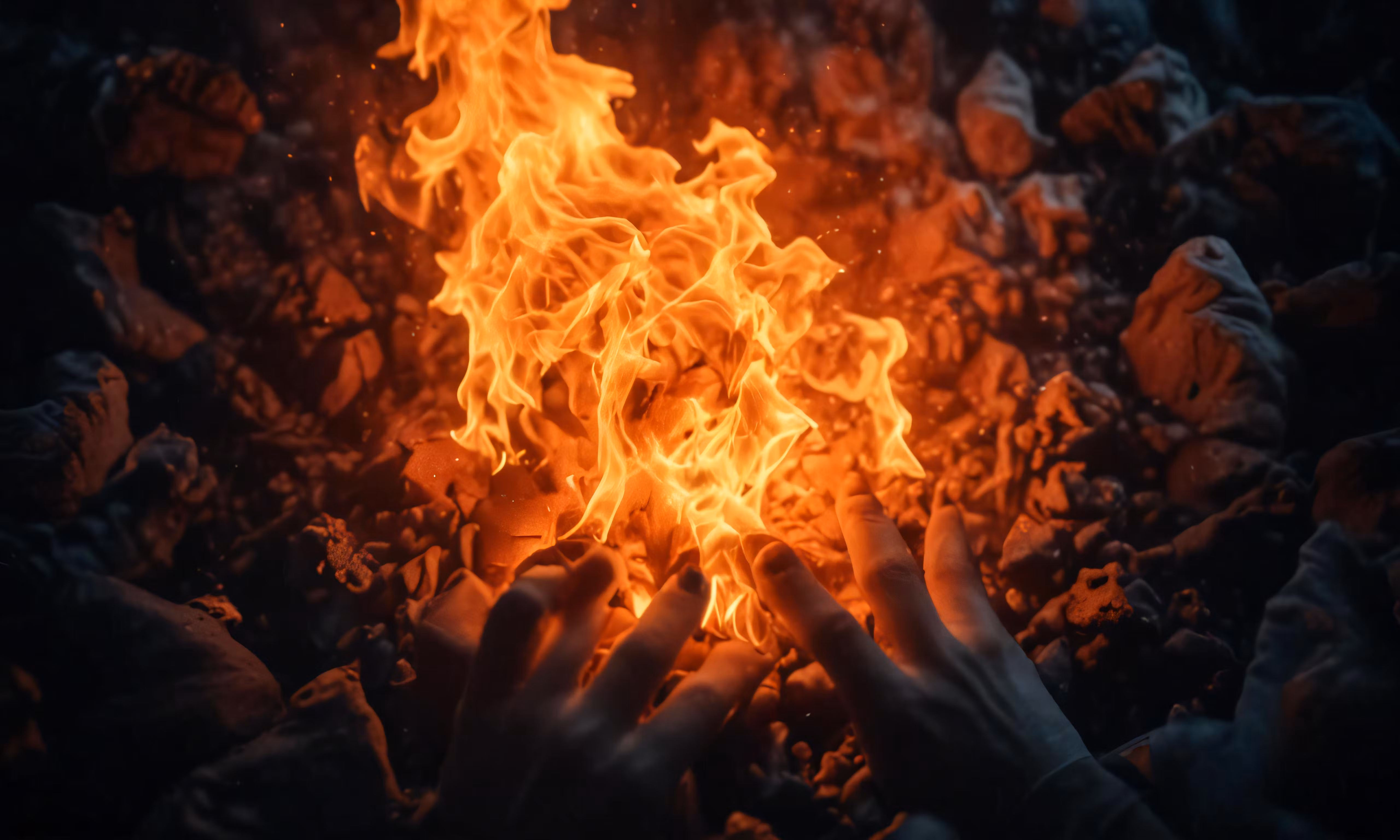 High resolution picture, free to use, two hands reaching over a bunch of fire