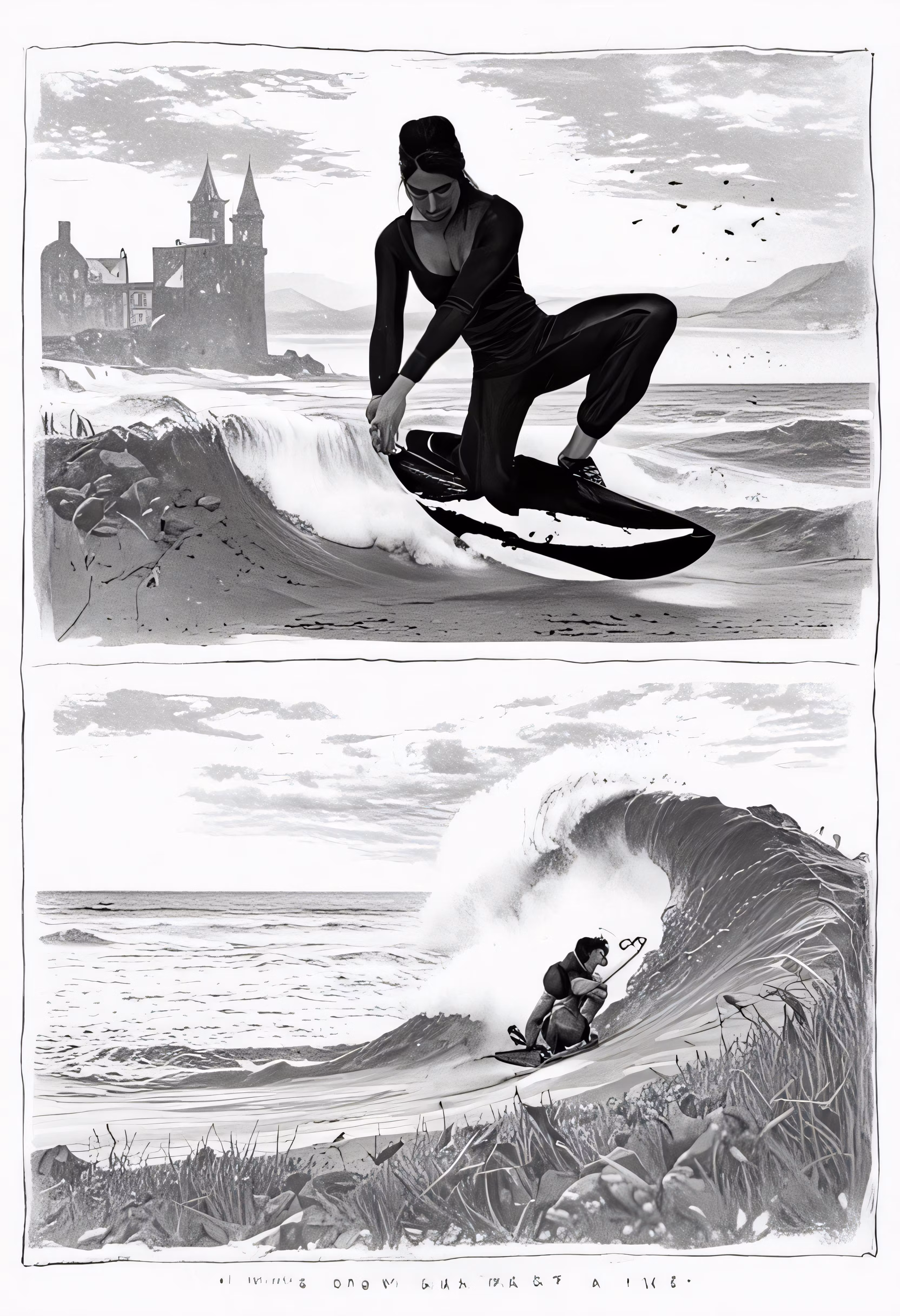High resolution picture, free to use, two illustrations of a man surfing and surfing on the beach