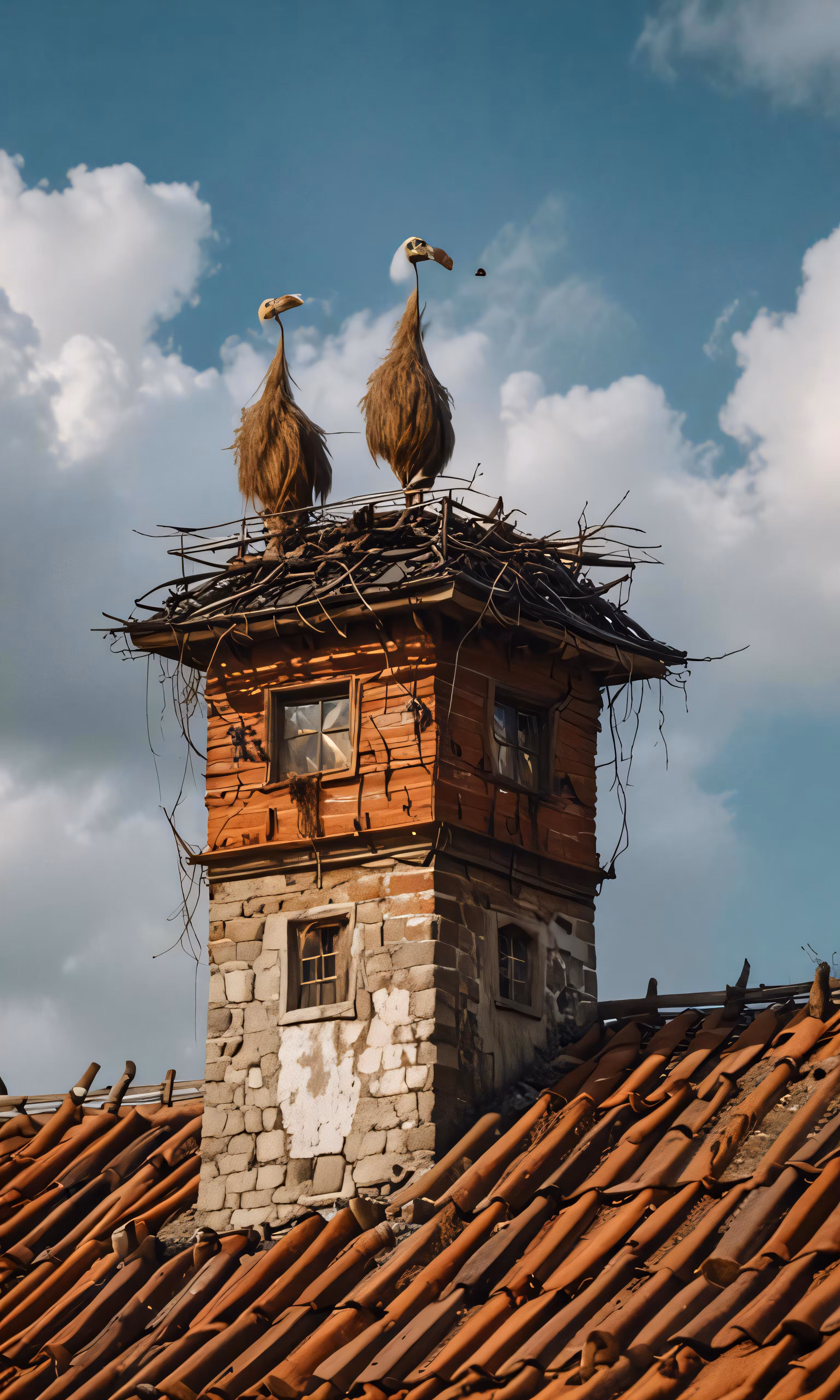 High resolution picture, free to use, two large birds perched on the top of a tower