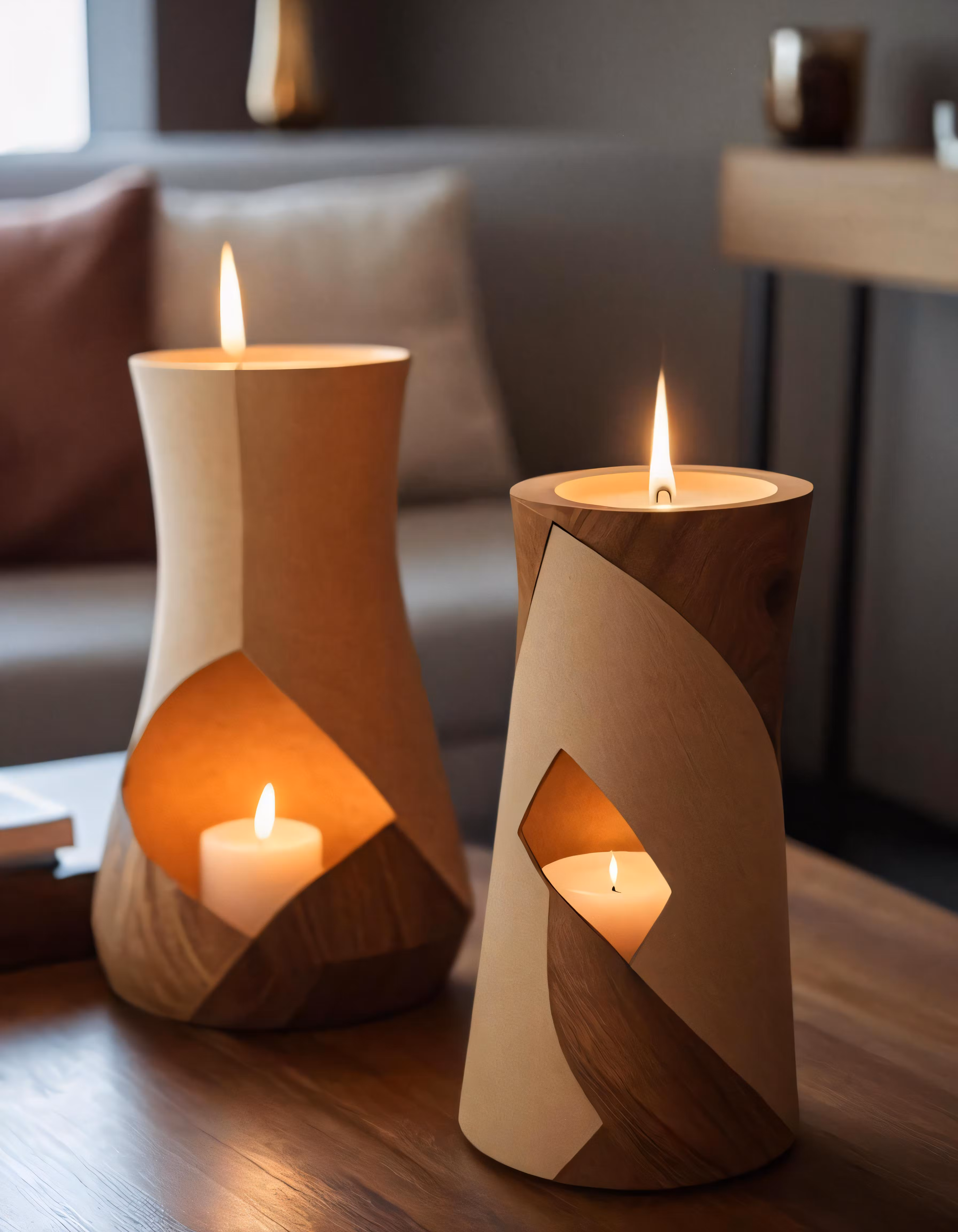 High resolution picture, free to use, two lit candles on a wood table in a room